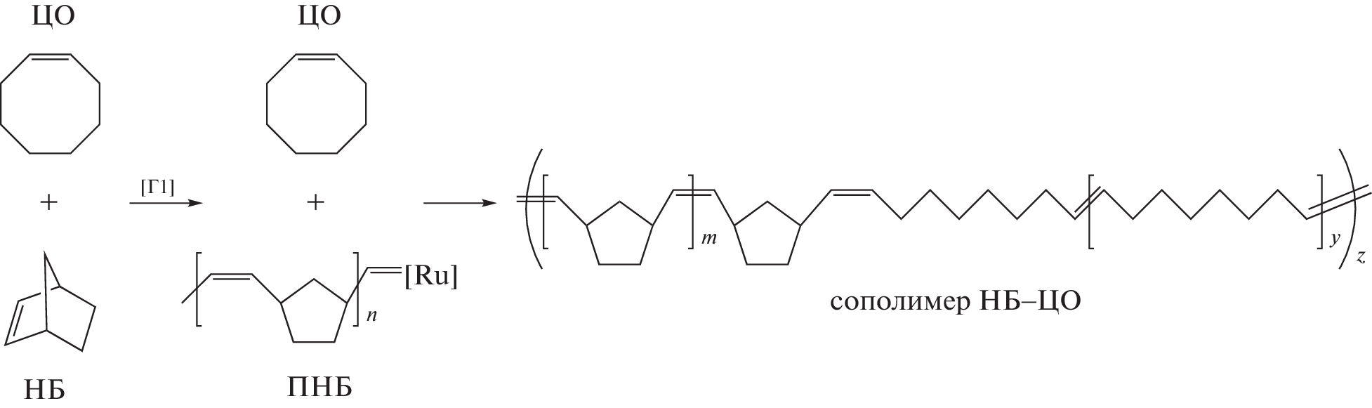 Впервые проведен однореакторный синтез статистических мультиблок-сополимеров норборнена и циклооктена. Показано, что Ru-карбеновый комплекс Граббса первого поколения дает возможность получать указанные сополимеры непосредственно из мономеров. В ходе однореакторного синтеза вначале происходит метатезисная полимеризация норборнена, обладающего существенно более высокой напряженностью цикла. Затем полимеризуется циклооктен и одновременно протекает межцепная реакция макромолекулярного кросс-метатезиса, в ходе которой формируется блочная структура сополимера. По сравнению с изученным ранее взаимодействием полинорборнена и полициклооктена однореакторный метод позволяет получать сополимеры с большей молярной массой при меньшем расходе катализатора.