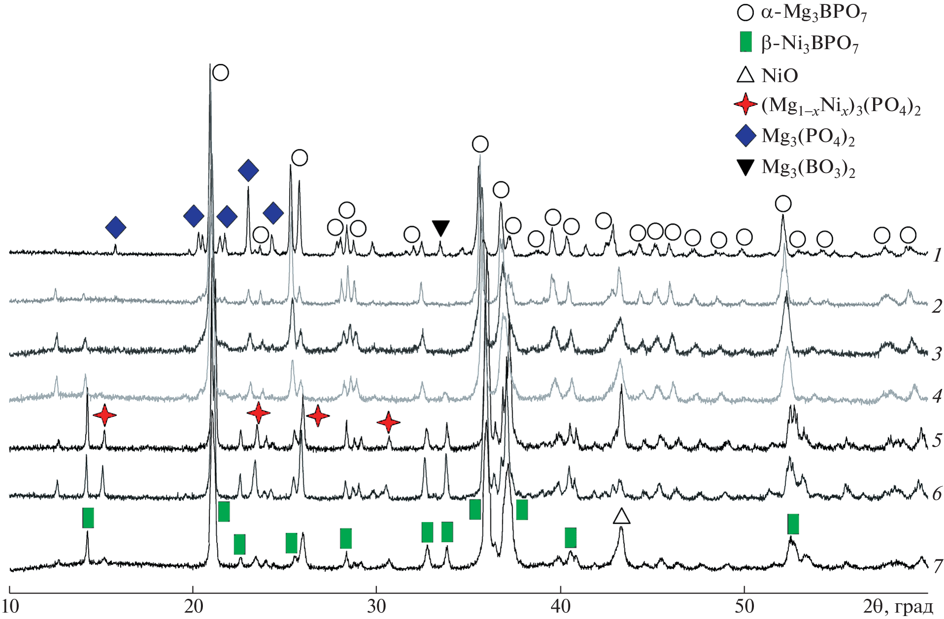 Samples of Mg3 – nNinBPO7 (n = 0–3), synthesized by gel combustion followed by annealing at 980°C and cooled in the inertial-thermal mode, were studied by X‑ray powder diffraction, infrared spectroscopy, and X-ray fluorescence spectrometry. For the first time, the crystalline phase of Ni3BPO7 with the β-Zn3BPO7 structure has been experimentally obtained. When the composition of the samples changed from Mg3BPO7 to Ni3BPO7, a region of coexistence of α‑Mg3BPO7 and β-Ni3BPO7 phases was found. An analysis of the diffuse reflectance spectra of the Mg1.5Ni1.5BPO7 sample showed the presence of Ni2+ cations in an arrangement not symmetric octahedral or tetrahedral.