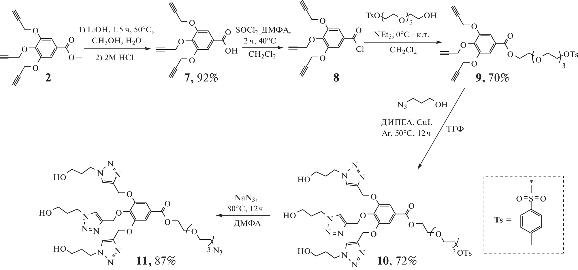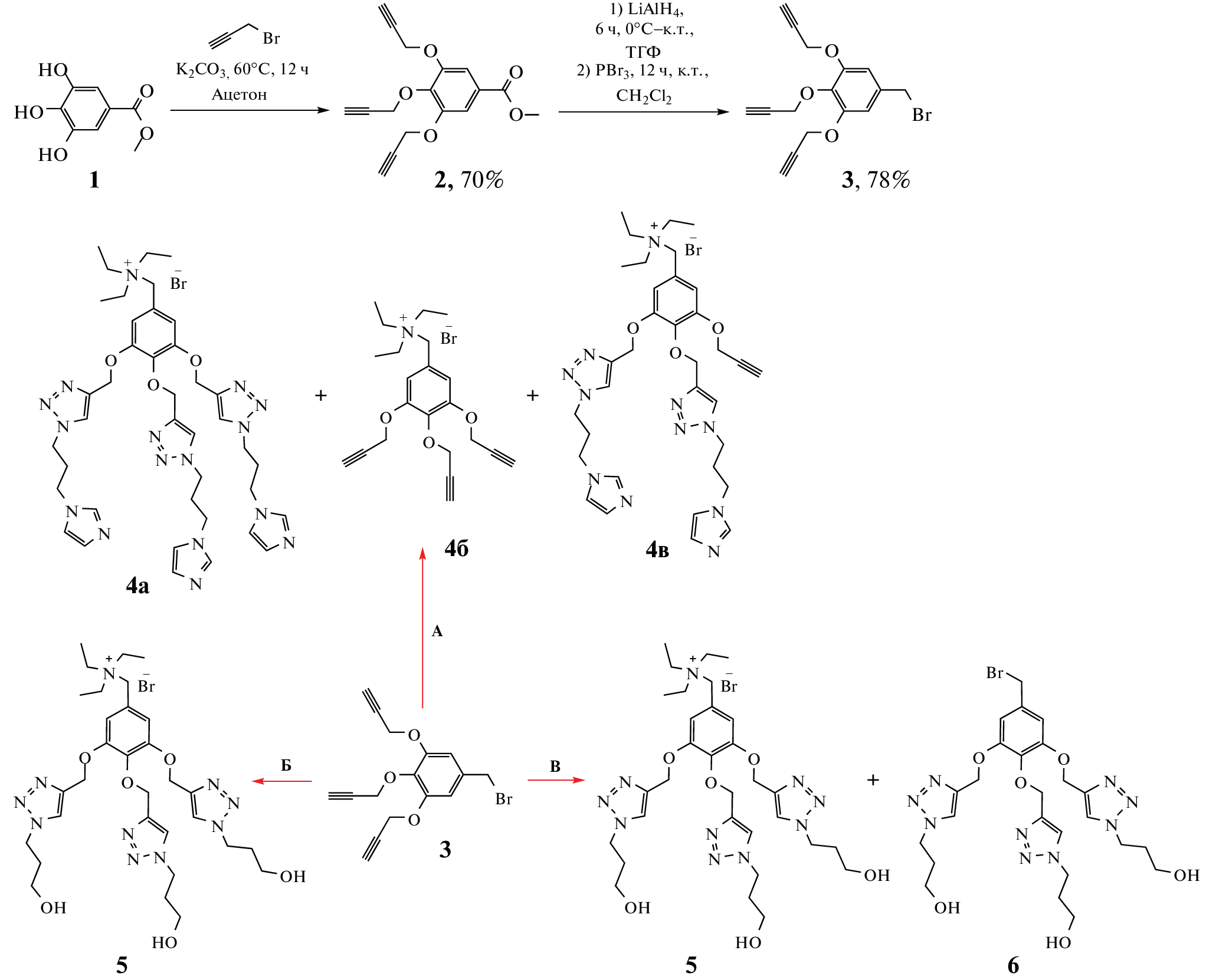 Постадийной модификацией галловой кислоты реакцией азид-алкинового циклоприсоединения впервые получен триазол-содержащий дендрон первого поколения, содержащий гидроксипропилтриазольные группы и тетраэтиленгликолевый линкер. Структура всех промежуточных соединений доказана современными физическими методами исследования. Установлено, что при использовании бромметилен-производных галловой кислоты в синтезе триазол-содержащих дендронов из-за высокой подвижности атома брома в бензильном положении образуются побочные продукты алкилирования используемых в реакции оснований (триэтиламина и диизопропилэтиламина).
