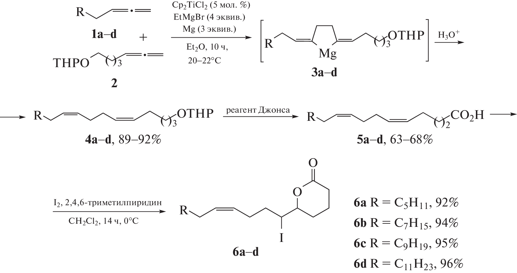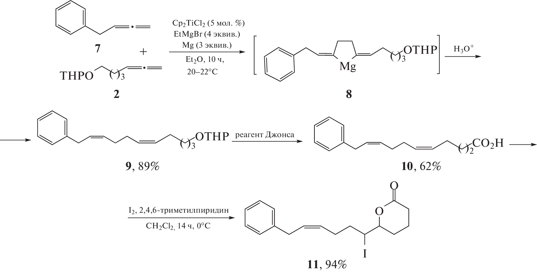 A previously undescribed phenyl-substituted iodo-δ-lactone of 11‑phenylundeca-5Z,9Z-dienoic acid was synthesized using the Ti-catalyzed intermolecular cross-cyclomagnesiation of an aromatic 1,2-diene with an O‑containing allene at the key stage in a 94% yield. The in vitro cytotoxic activity of the obtained alkyl- and phenyl-substituted iodo-δ-lactones 5Z,9Z-dienoic acids was studied in relation to the cell lines Jurkat, K562, U937, HL60, Hek293, and the effect on the cell cycle and the ability to induce apoptosis with using flow cytometry.