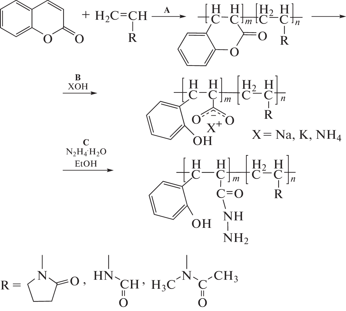 Radical copolymerization of coumarin with N-vinylamides (N‑vinylpyrrolidone, N-methyl-N-vinylacetamide, N-vinylformamide) was used to prepare copolymers of various natures and varied molecular masses. After the subsequent reactions in polymer chains, water-soluble copolymers of salts of oxycinnamic acid and its hydrazides were obtained. The synthesized copolymers of salts and hydrazides of oxycinnamic acid with N-vinylamides have low cytotoxicity and demonstrate the pronounced antiviral activity against human respiratory syncytial virus (strain A2).