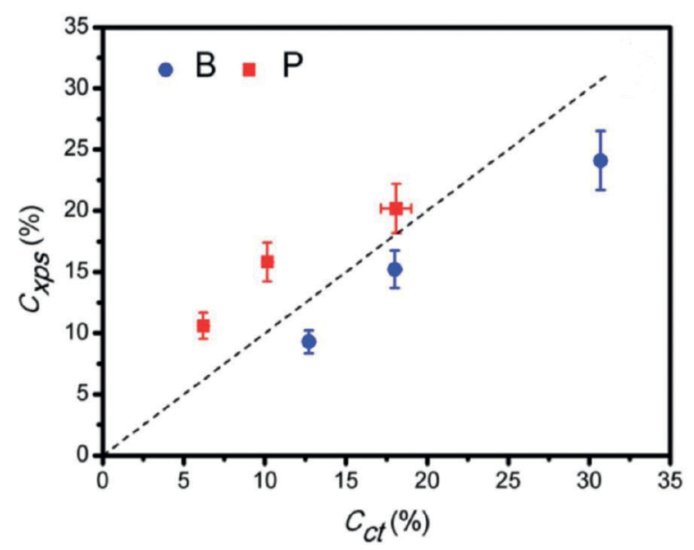 Рис. 1. Сравнение содержаний примесей (ат. %) бора и фосфора, определенных химическим титрованием (cct) и из спектров РФЭС (cxps); пунктирная линия соответствует совпадению определяемых значений. Публикуется с разрешения правообладателя [18]. Copyright 2015 John Wiley and Sons.