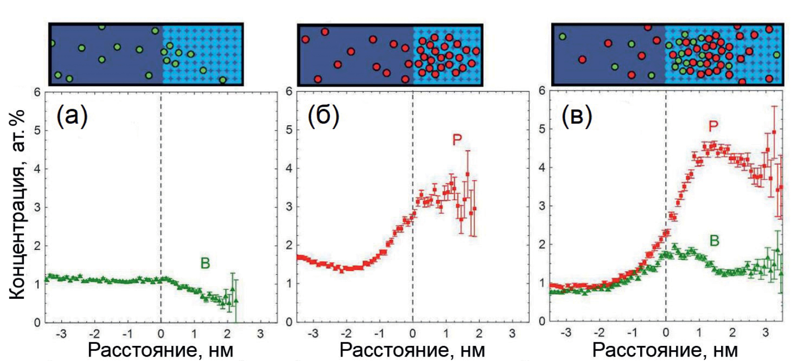 Совместное введение бора и фосфора в нестехиометрический оксид перед отжигом способствует включению обеих примесей в нч-Si. При отжиге богатого кремнием БФСС при 1250°C проксиграммы, построенные по данным атомно-зондовой микроскопии, выявили локальные максимумы концентрации бора и фосфора внутри наночастиц, причем максимум для бора был расположен ближе к поверхности (рис. 2в). Для того же образца установлено рекордное СП бора для частиц в матрице – 1.7 ат. %. Проведенный анализ кластеров показал, что с ростом температуры отжига уменьшается доля одиночных атомов бора и фосфора в наночастице и возрастает доля кластеров P–P и B–P. Бор и фосфор как элементы 13-ой и 15-ой групп соответственно способны как к зарядовой компенсации друг друга в кремнии, так и к компенсации размерных напряжений [32].