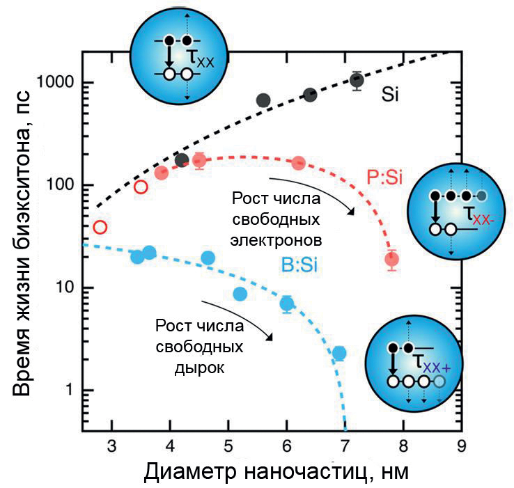 Появление настоящего обзора мотивировано обнаружением новых функциональных свойств у легированных наночастиц кремния (нч-Si) в прошедшее десятилетие. В 2013 г. для сильнолегированных фосфором нч-Si продемонстрировано существование локализованного плазмонного резонанса (ЛПР) в ближней ИК-области [7], что открыло возможности для их использования в фотонике и плазмонике. В 2019 г. совместным легированием нч-Si бором и фосфором удалось расширить спектральный диапазон фотолюминесценции (ФЛ) частиц в инфракрасную область вплоть до 1450 нм, что повысило привлекательность материала для использования в качестве биомаркеров или для усиления сигнала в волоконно-оптических линиях связи [8].