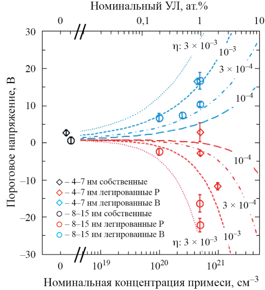 После отжига легированные нч-Si оказываются включенными в матрицу диэлектрика. Контролируемое напыление слоев диэлектрика между слоями, обогащенными кремнием, позволяет получать сверхрешетки из частиц. Такой способ изготовления обеспечивает бо́льшую монодисперсность ансамбля частиц и более равномерное распределение примеси [29, 41, 65]. Добавление прекурсора примеси вызывает размягчение стеклянной матрицы, что ведет к большей диффузионной длине атомов кремния в матрице во время отжига и к росту размера образующихся частиц [29, 34, 40], также при введении примеси в виде оксида на размер частиц влияет сопутствующее изменение кислородной нестехиометрии [34, 35]. Легирующая примесь распределяется между нч-Si и матрицей, что затрудняет исследование материала и однозначное описание его свойств. Так, легирование нч-Si в матрице нитрида сурьмой подтверждается малозаметным плечом в спектрах РФЭС, ростом проводимости образцов на несколько порядков, ростом концентрации носителей заряда в композите, определенной по эффекту Холла. В то же время даже эта комбинация признаков не позволяет ответить на вопрос о положении сурьмы на интерфейсе или внутри нч-Si [50].