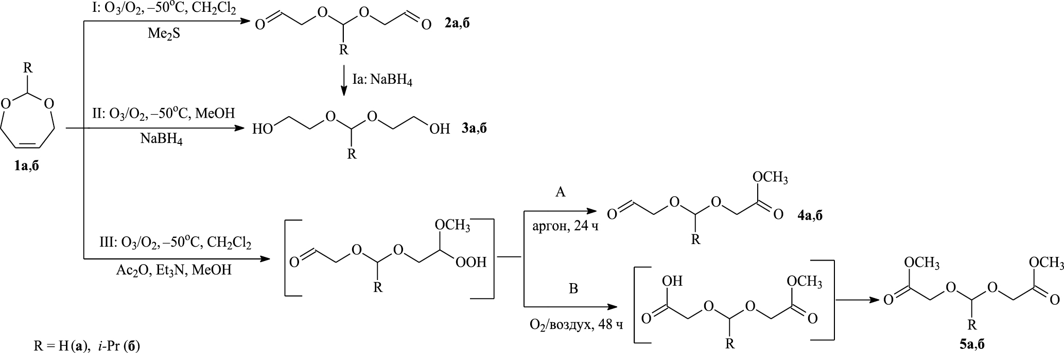 Нами впервые изучено низкотемпературное озонолитическое расщепление 4,7-дигидро- 1,3-диоксепина 1а и 2-изопропил-4,7-дигидро- 1,3-диоксепина 1б (схема 1).