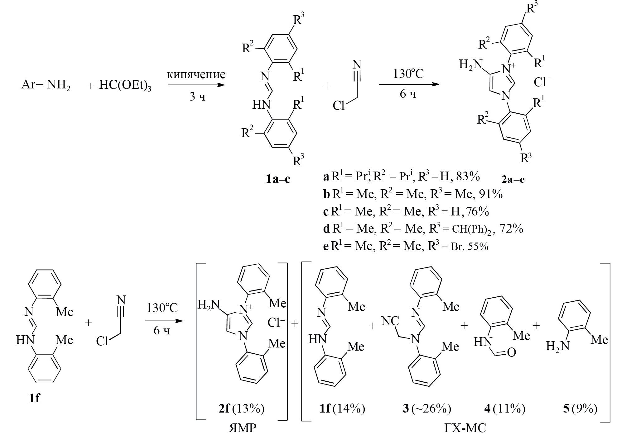 В оптимизированных условиях нами исследована реакция различных формамидинов с ХА. В результате взаимодействия с ХА формамидины 1a–e, содержащие N,N'-2,6-диалкиларильные группы, приводили к образованию соответствующих имидазолиевых солей 2a–e с выходами 55–91% (схема 1).