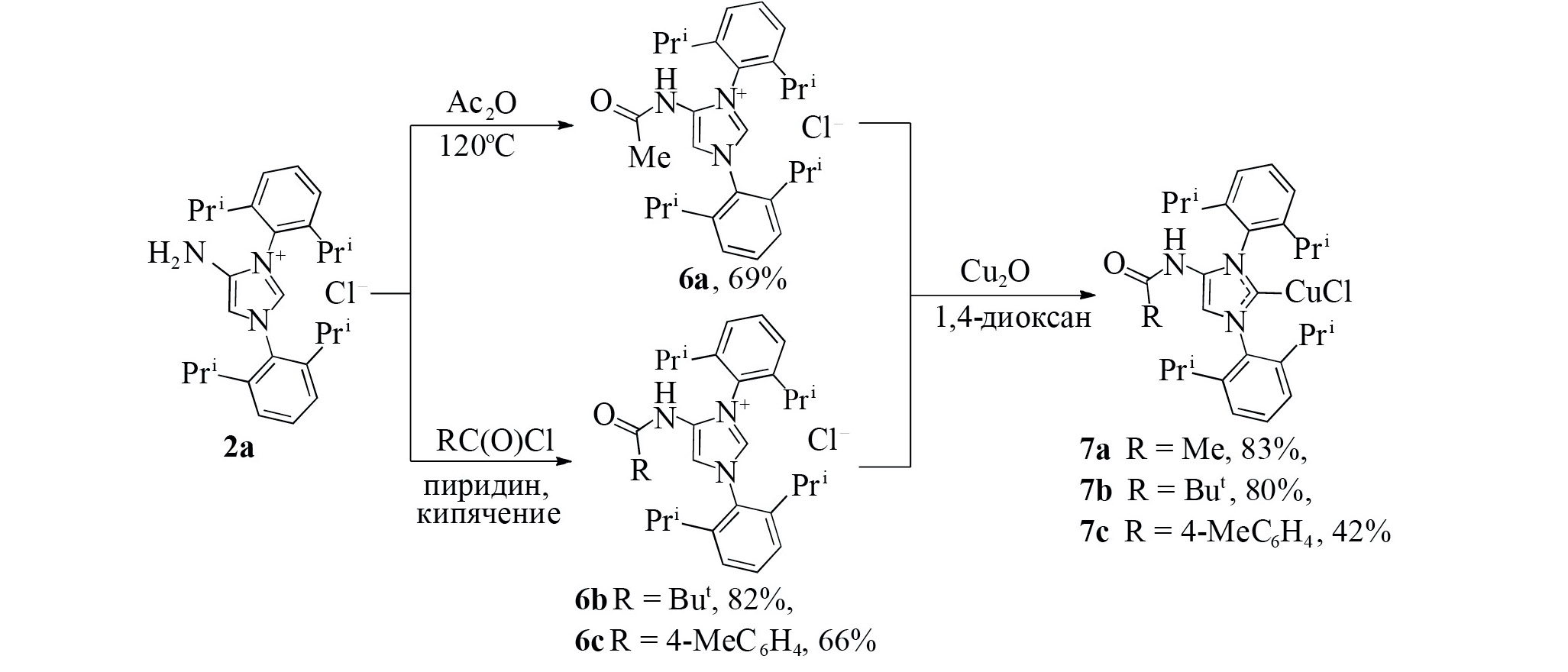 Осуществить селективное металлирование соединения 2а при нагревании с оксидом меди (I) по описанной в литературе методике синтеза комплексов (NHC)CuCl [34] не удалось: при всех попытках образовывалась трудноразделимая смесь соединений, что, предположительно, можно объяснить мультидентатностью соединения 2а (возможность координации с участием как карбенового атома С, так и аминогруппы) и его недостаточной устойчивостью в условиях реакции. Поэтому аминогруппа была защищена путем ацилирования. Нагреванием соединения 2а в уксусном ангидриде при 120°С получено ацетилпроизводное 6а, а кипячением 2а в пиридине с хлорангидридами пивалоиловой или пара-толуиловой кислот синтезированы ацилпроизводные 6b и 6c соответственно (схема 2). Нагреванием соединений 6а–с с оксидом меди (I) в диоксане при 100°С получены комплексы (RCONH–NHC)CuCl – соединения 7а–с (схема 2).