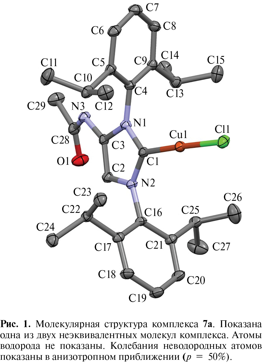 Согласно данным РСА, в элементарной ячейке кристалла соединения 7a (рис. 1) содержатся две кристаллографически неэквивалентных молекулы (А и Б), отличающиеся разворотом ацетиламиногруппы относительно плоскости имидазольного цикла. Например, псевдоторсионный угол C2–C3–C28–O1 в молекуле А составляет –13.2(2)°, тогда как в молекуле Б аналогичный угол равен 10.62(2)°. Геометрические параметры молекулы комплекса 7а близки к параметрам комплексов (NHC)CuCl с обычными NHC-лигандами IPr (1,3-бис-(2,6-диизопропилфенил)имидазол-2-илиден) [41, 42] и IMes (1,3-бис(2,4,6-триметилфенил)имидазол-2-илиден) [43, 44]. Угол С–Cu–Cl составляет 176.50(7)° в молекуле А и 176.76(7)° в молекуле Б. Длина связи С–Cu равна 1.880(2) Å в молекуле А и 1.874(2) Å в молекуле Б, что очень близко к длине аналогичной связи в комплексах (IPr)CuCl и (IMes)CuCl (1.881–1.956 Å). Длина связи C–Cl составляет 2.1069(5) Å в молекуле А и 2.1022(5) Å в молекуле Б, что также близко к длине аналогичной связи в комплексах с лигандами IPr и IMes (2.089–2.106 Å). N-Арильные группы почти перпендикулярны плоскости имидазольного цикла. Например, торсионный угол C3–N1–C4–C5 составляет 102.8(2)°. Длины связей и валентные углы в имидазольном цикле близки к таковым в комплексах с лигандами IPr и IMes.