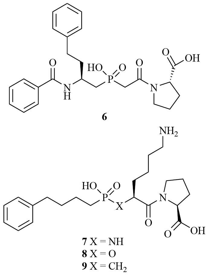 АПФ (кининаза II, пептидил-дипептидаза A, КФ 3.4.15.1) является сегодня, вероятно, наиболее важной мишенью с точки зрения медицинского применения ингибиторов фосфината Zn-металлопротеиназ. То обстоятельство, что АПФ может участвовать в регуляции гемопоэтических стволовых клеток путем постоянного разложения Ac-Ser-Asp-Lys-Pro, инициировало разработку ингибиторов АПФ (соединения 6–9) (рис. 4).