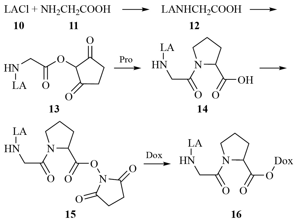 Для деградации чужеродных клеток используют доксорубицин (Dox). Сложность введения Dox пациентам заключается в высокой цитотоксичности этого вещества [18–20]. Поиск производных Dox с меньшей цитотоксичностью привел к синтезу пептидных производных доксорубицина типа Boc-Gly-Pro-Dox (рис. 1).