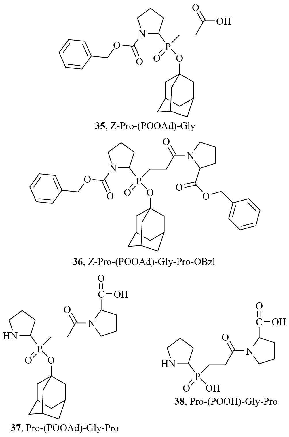 Фосфинатные пептиды являются мощными ингибиторами бактериальных коллагеназ [30]. Также оказалось, что фосфинатные псевдопептиды (соединения 3–5) ведут себя как сильнодействующие ингибиторы матричных металлопротеиназ (ММР) (рис. 3).