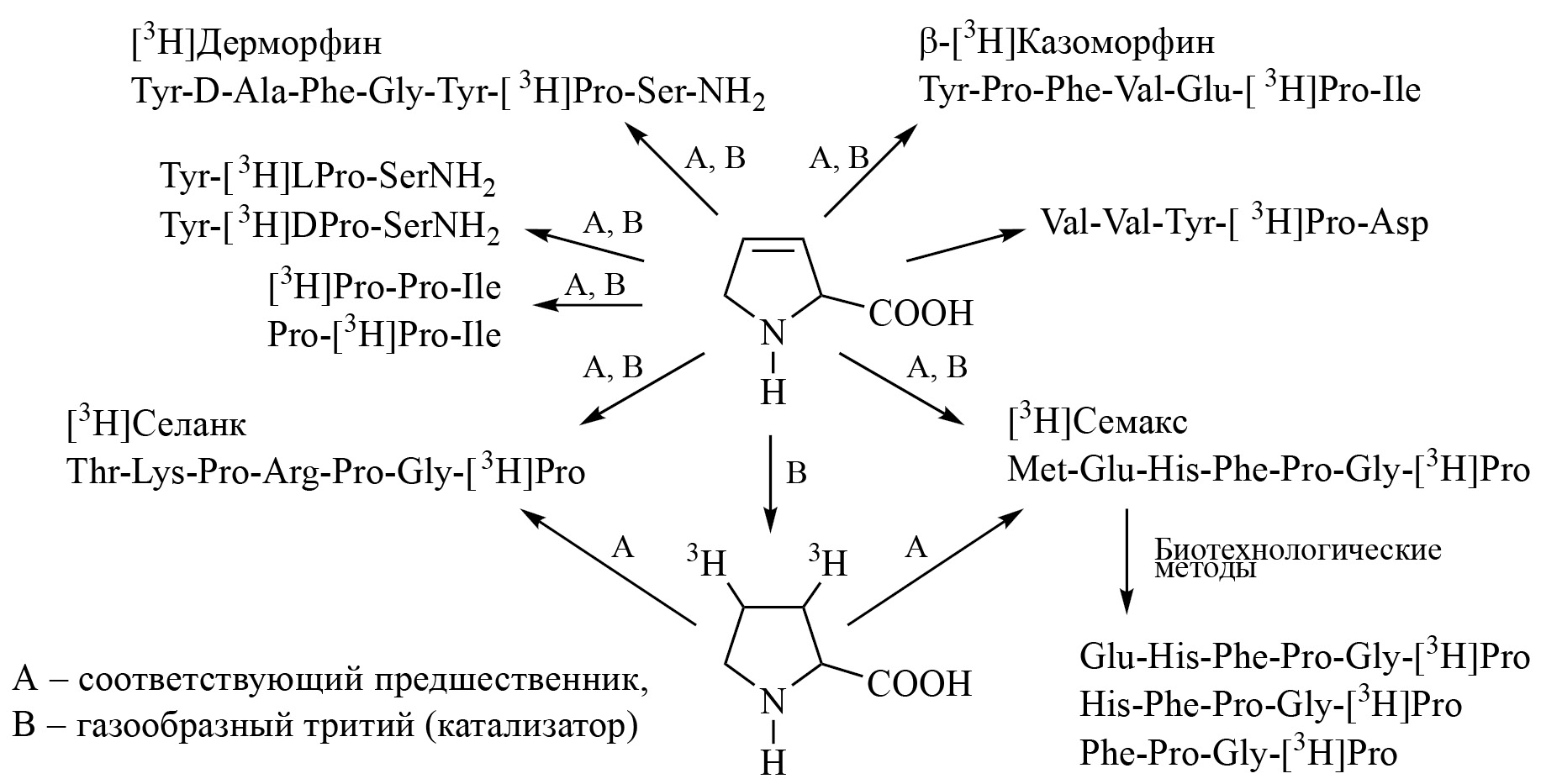 A number of modern methods for the preparation of hybrid compounds using peptide fragments are described. Biologically active compounds were modified using organic acids, proline (Pro-Gly-Pro) and phosphinate fragments. The methods of synthesis of hybrid compounds that can be used to obtain organic compounds labeled with hydrogen isotopes are shown. Cytotoxicity, specific binding of synthesized compounds to receptor systems and other characteristics of these compounds have been studied.