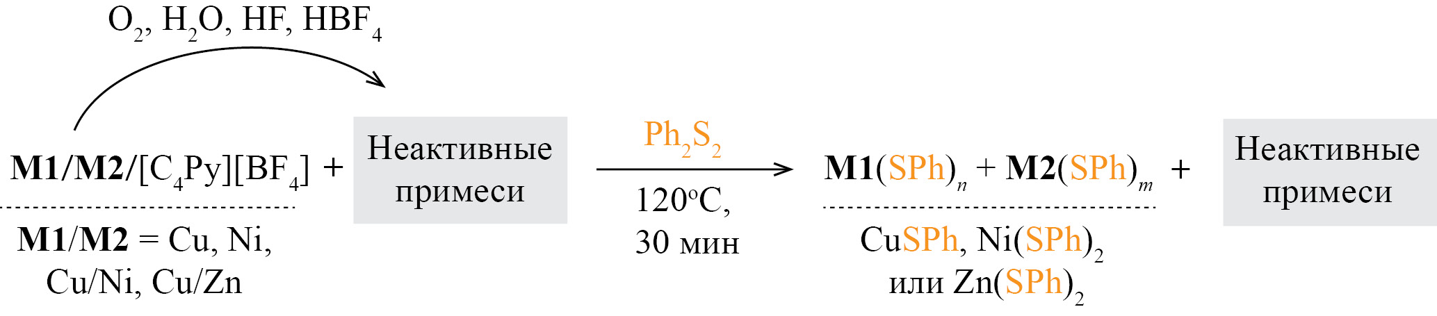 Реакция наночастиц металлов с дифенилдисульфидом. 200 мкл дисперсии наночастиц металлов (4 мкмоль металла) в ионной жидкости [C4Py][BF4] помещали в пластиковую микропробирку объемом 1.5 мл и добавляли к ней 43.6 мг (200 мкмоль) дифенилдисульфида. Реакционную смесь нагревали при периодическом перемешивании в течение 30 мин при 120°С. После окончания реакции небольшую порцию реакционной смеси (порядка 1 мкл) отбирали для анализа методом СПЭМ, а оставшуюся массу разбавляли 2 мл ацетонитрила. Выпавший осадок отделяли центрифугированием (14500 об. мин–1, 3 мин), а затем промывали ацетонитрилом (3 раза по 1 мл) с промежуточным центрифугированием (14500 об. мин–1, 3 мин). Полученный продукт сушили в токе воздуха, а затем исследовали методом рентгеноспектрального микроанализа.