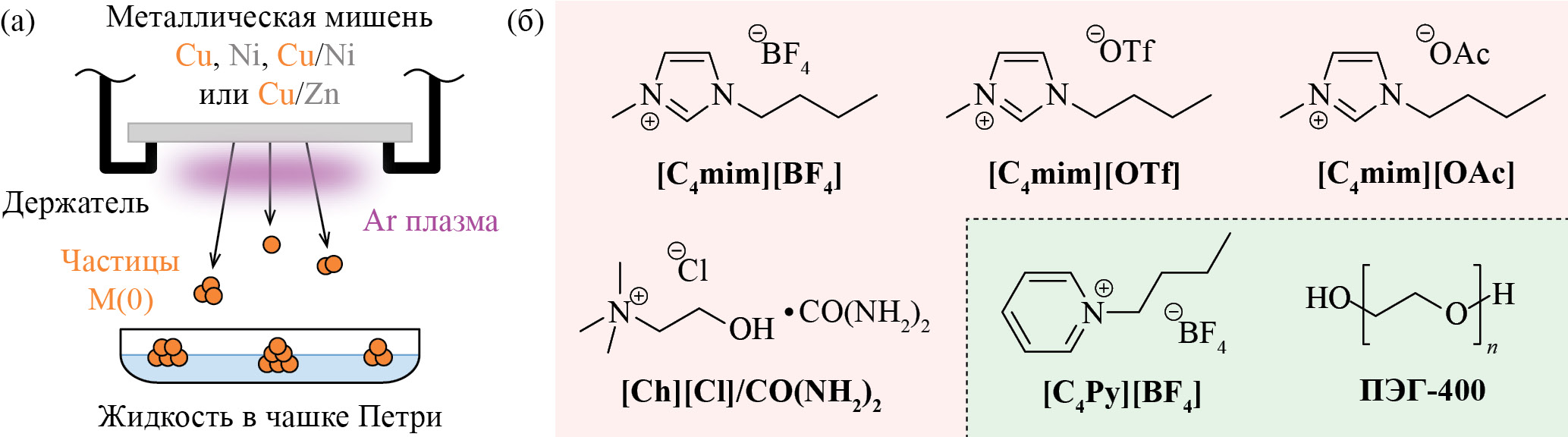 Рис. 1. (а) Принципиальная схема устройства магнетронного распыления. M(0) – металл в нулевой степени окисления. (б) Жидкие вещества, использованные в качестве среды. Красным цветом отмечены жидкости, совместимые с вакуумом камеры для напыления, но взаимодействующие с распыляемыми частицами; зеленым – инертные устойчивые среды, пригодные для использования в синтезе наночастиц.