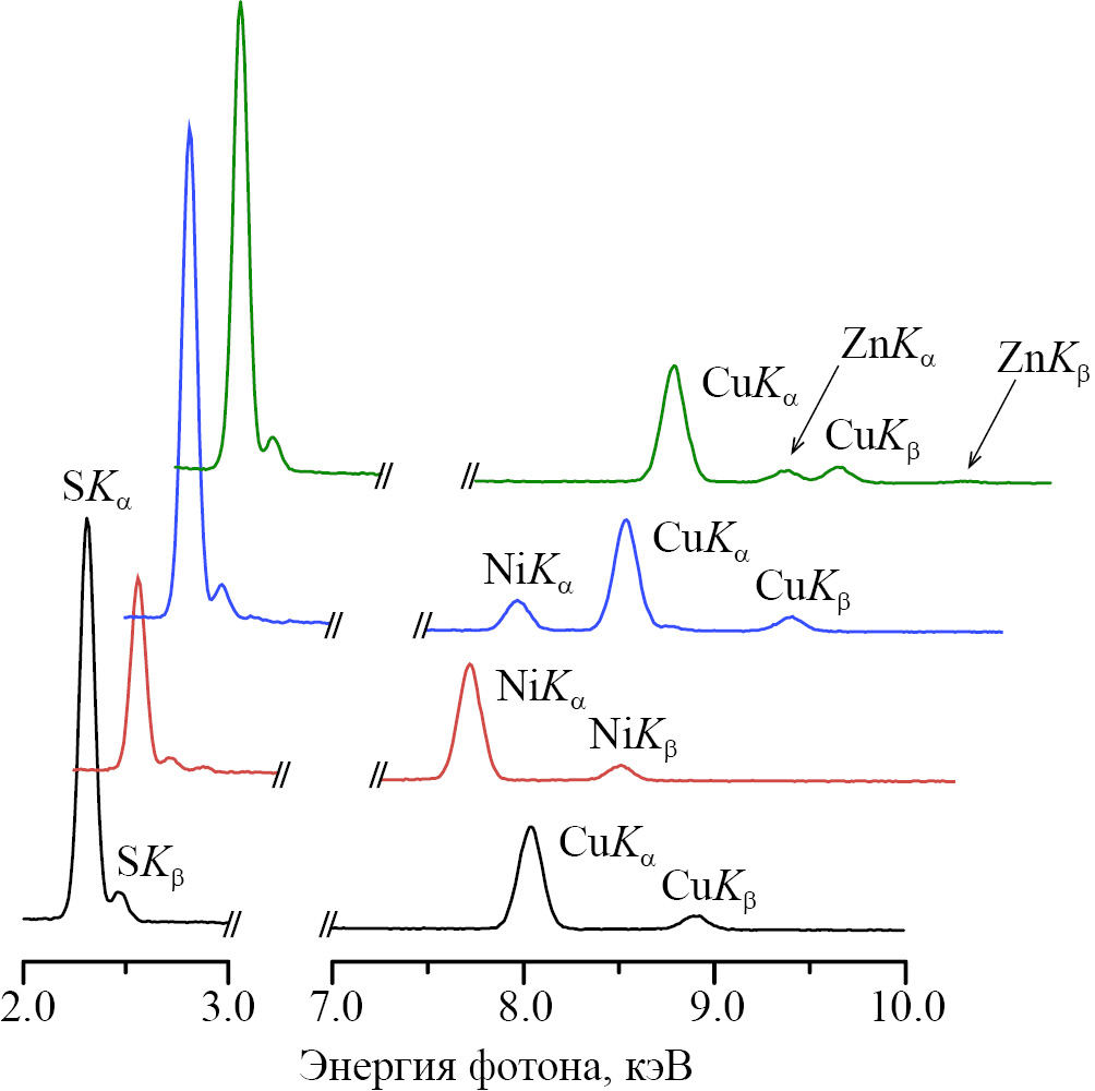 Рис. 2. Энергодисперсионные рентгеновские спектры в диапазонах 2–3 кэВ и 7–10 кэВ для образцов металлсодержащей фазы, выделенной после реакции между дифенилдисульфидом и частицами меди (черная кривая), никеля (красная кривая), медно-никелевого сплава (синяя кривая) или медно-цинкового сплава (зеленая кривая) в среде пиридиниевой ионной жидкости.