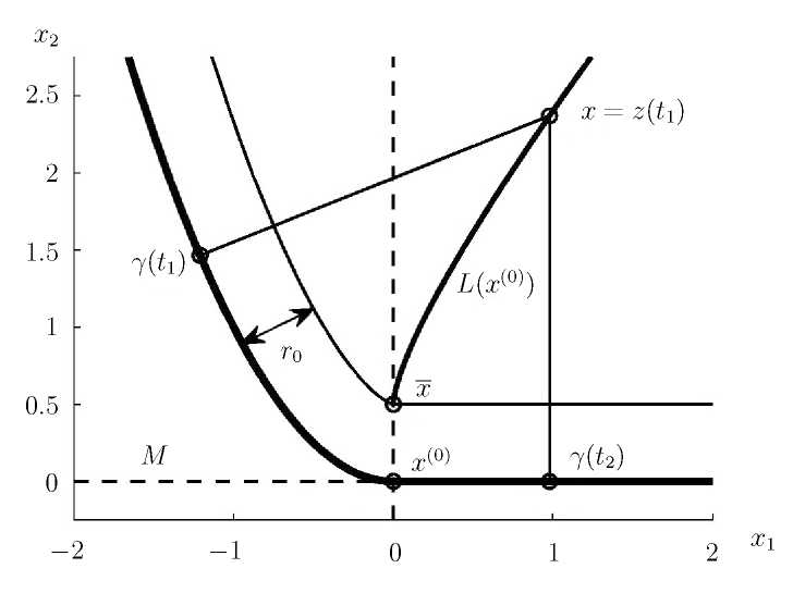 Иллюстрация описанной ситуации приведена на рис. 1. На нем изображены невыпуклое множество M, его псевдовершина биссектриса с крайней точкой центр опорного шара в некоторой точке и ее метрические проекции и на M а также максимальный чебышевский слой величины