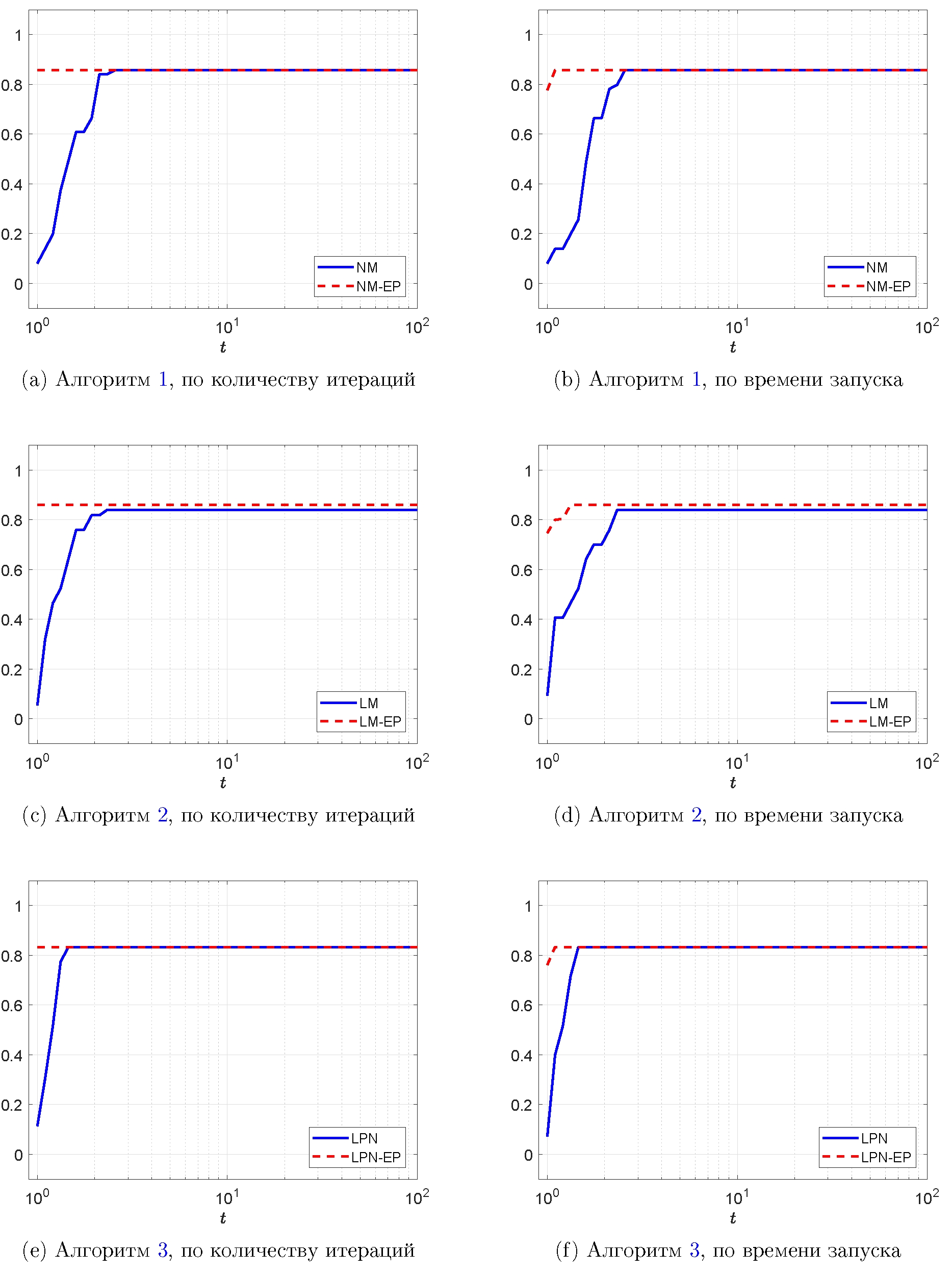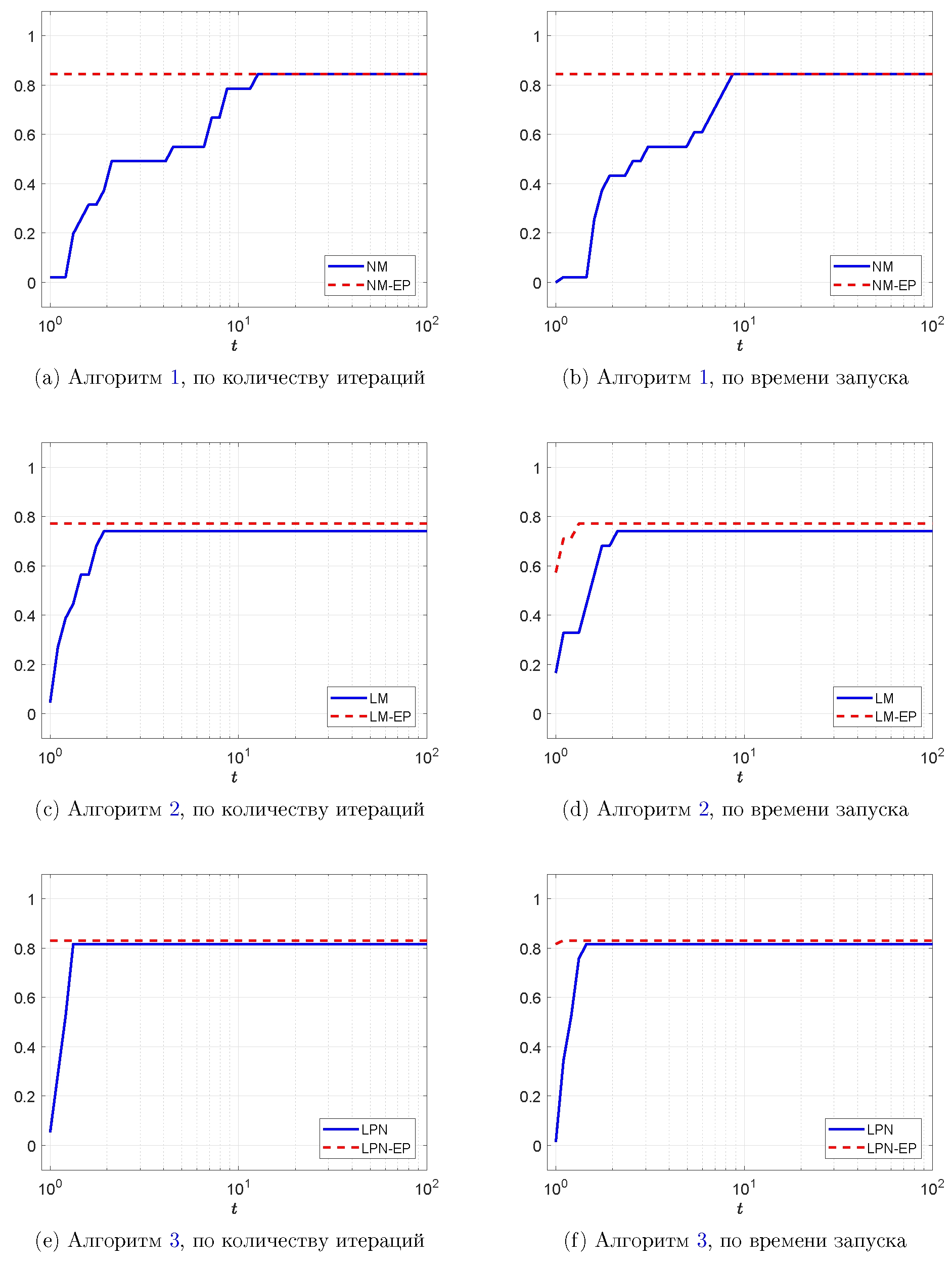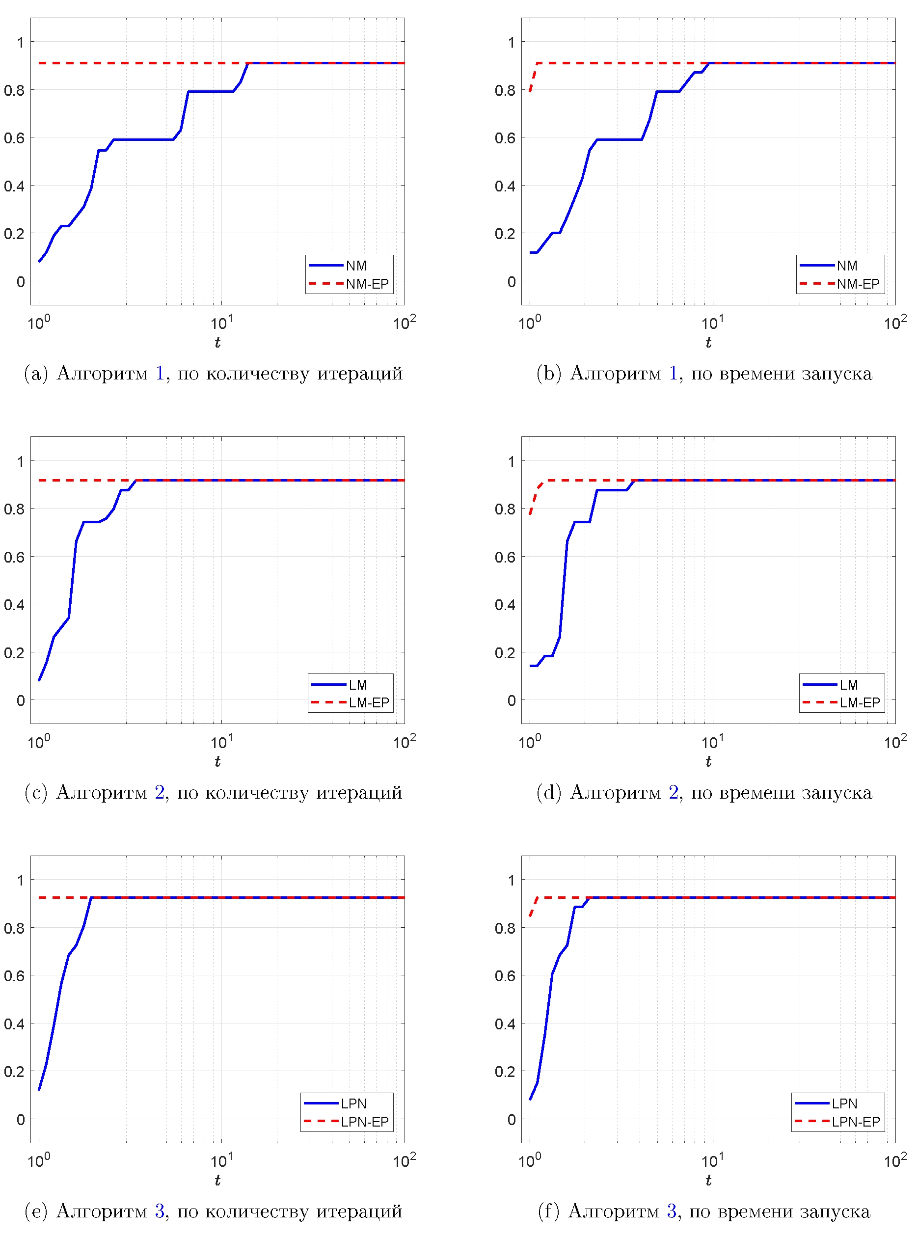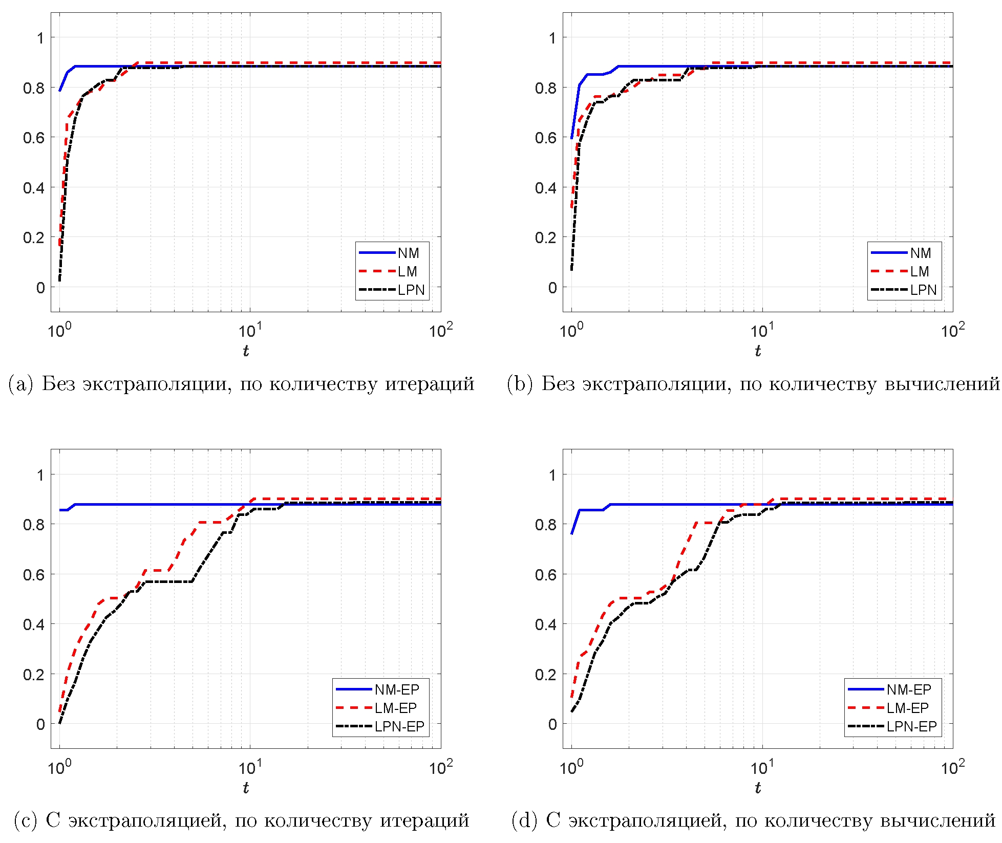 Результаты эксперимента на наборе Misc представлены на рис. 2, и выводы из них аналогичны выводам для MGH: эффект от экстраполяции для NM больше, чем для метода LM, а для метода LM больше, чем для метода LPN.