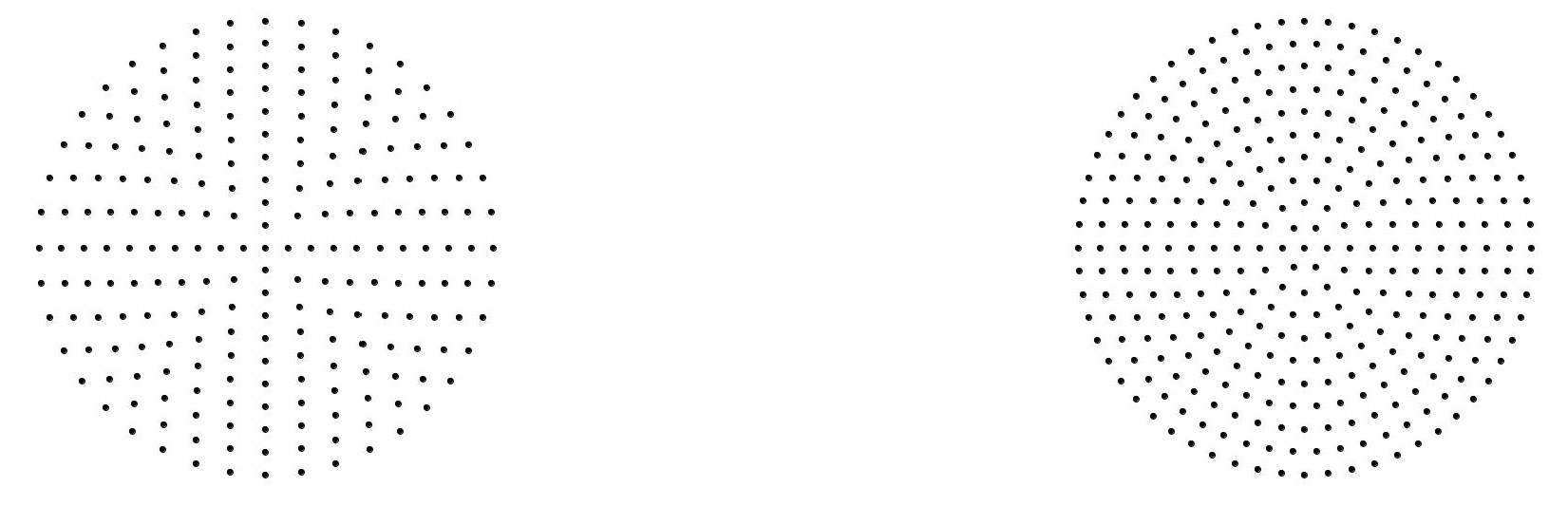 Замкнутый единичный круг, пробегаемый переменной мы разобьем следующим образом. Разбиение начинается с точки в начале координат, которую следует рассматривать как отдельный шаг алгоритма разбиения. Далее круг разбивается на воображаемые концентрические окружности, величины радиусов которых делят отрезок на равные части. На окружности с наименьшим положительным радиусом поместим 4 точки, разбивающие окружность на равные части, первая из этих точек должна лежать на положительном луче оси абсцисс. На окружности со вторым по величине радиусом поместим 8 точек, разбивающие окружность на равные части, первая из этих точек должна лежать на положительном луче оси абсцисс. На окружности с третьим по величине радиусом поместим 12 точек, разбивающие окружность на равные части, первая из этих точек должна лежать на положительном луче оси абсцисс. И так далее, пока не дойдем до единичной окружности.
