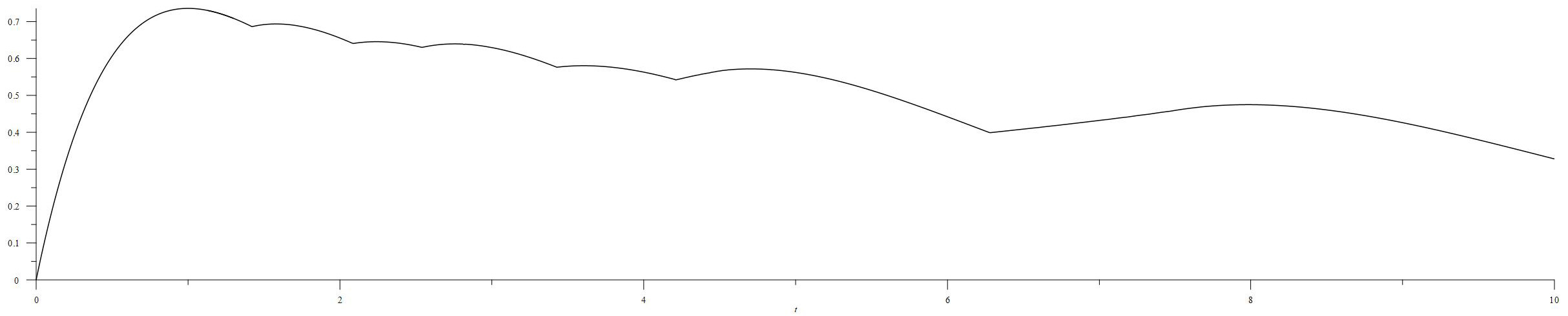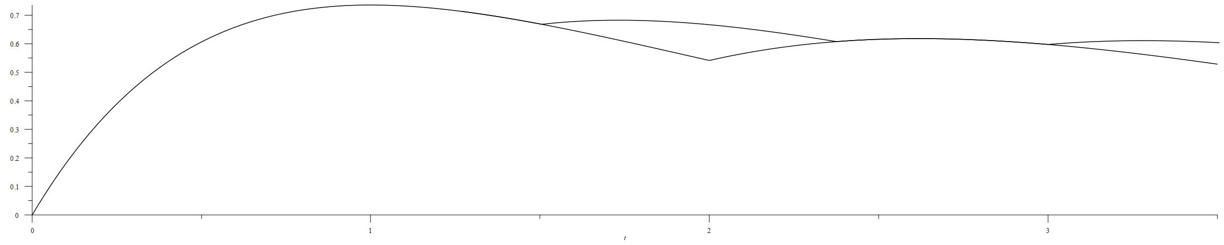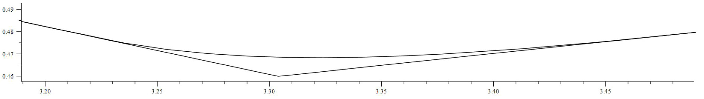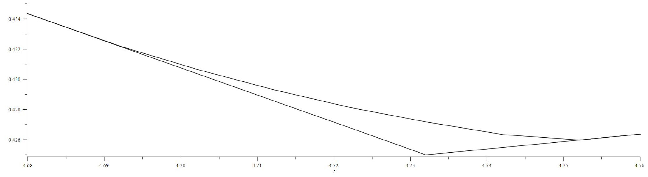 Как и в предыдущих случаях, весьма скромными вычислениями получено очень хорошее приближение при Для функций с действительными коэффициентами результаты аналогичны. Отличие между кривыми в случае действительных и комплексных коэффициентов показано крупным планом в масштабе 1:1 на рисунке 11. Расчеты для функций с действительными коэффициентами проведены с разбиением 0.01 по В этом разбиении по t — 685 точек, по — 101 точка, а по — 201 точка.