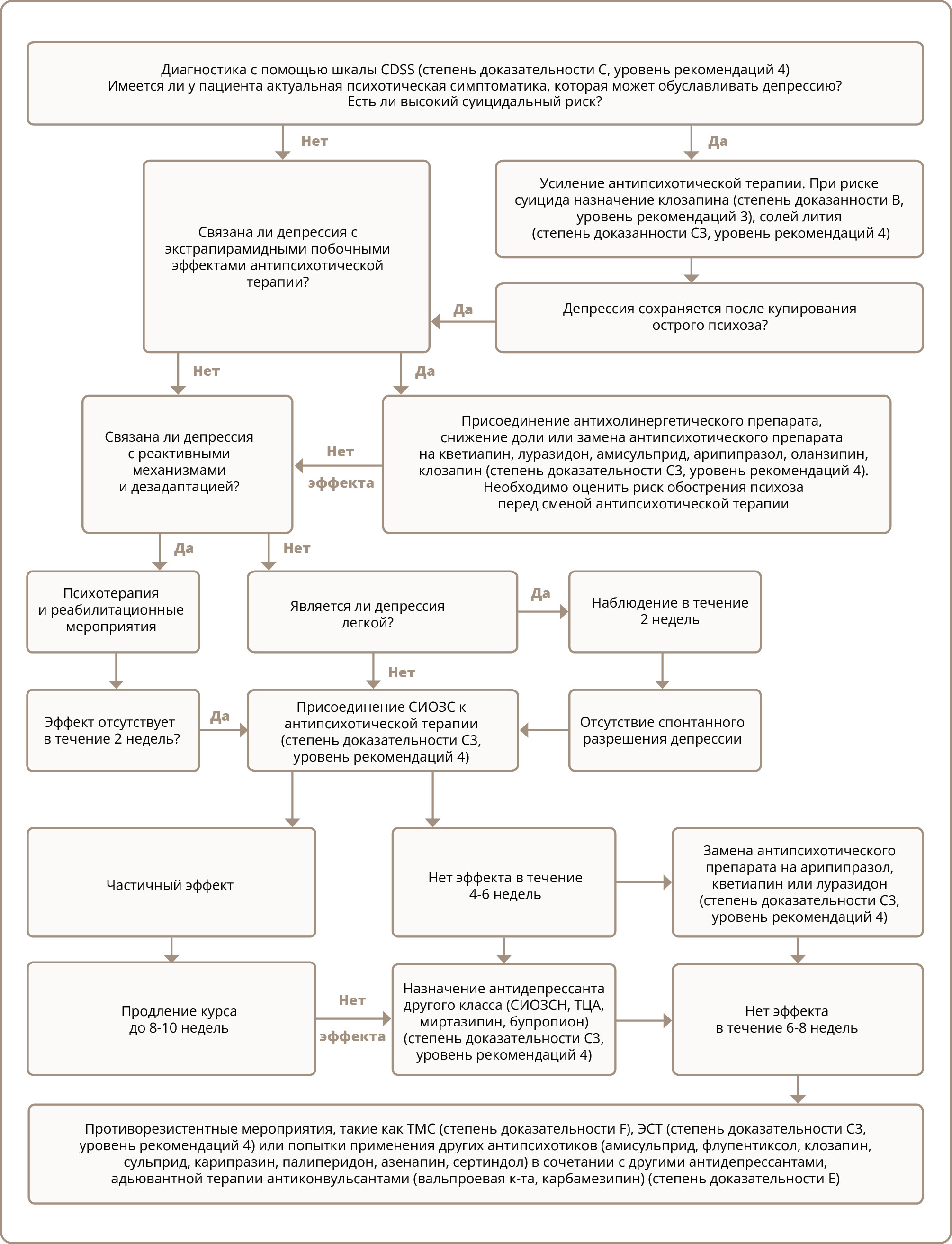 Thus, a rational approach to the treatment of depression in schizophrenia follows the differential diagnosis and the determination of the contribution of reactive-personality and pharmacogenic factors to its development. If a patient receiving FGA has an episode of depression, the question arises as to how much antipsychotic therapy is responsible for the symptoms similar to depression, both extrapyramidal (akinesia or akathisia) and dysphoria directly induced by neuroleptic agents. This problem can be solved in three ways: 1) reduction of the antipsychotic dose, subject to the time available to do it safely; 2) adding and dose titration of antiparkinsonian (anticholinergic) drug, benzodiazepine or beta-blocker (the latter are effective for akathisia); 3) replacement of FGA with SGA. If a patient already receiving SGA develops an episode of depression, the same approaches apply. Dose reduction and the addition of anticholinergic agents are most advisable when using SGA, which have dose-dependent extrapyramidal side effects (risperidone, amisulpride, ziprasidone, cariprazine). An alternative option is to replace one SGA with another. In patients with schizophrenia havingnopositiveeffectofantiparkinsonian drugs, antidepressants can be prescribed to achieve the desired result. Based on the aforementioned analysis of the literature data and in accordance with the principles of evidence-based medicine, we proposed an algorithm for the treatment of depression in schizophrenia [130][131], the latest version of which is shown in the Figure 1. The algorithm indicates the levels of evidence and strength of recommendations for proposed interventions, as recommended by the World Federation of Societies for Biological Psychiatry (WFSBP) [132].