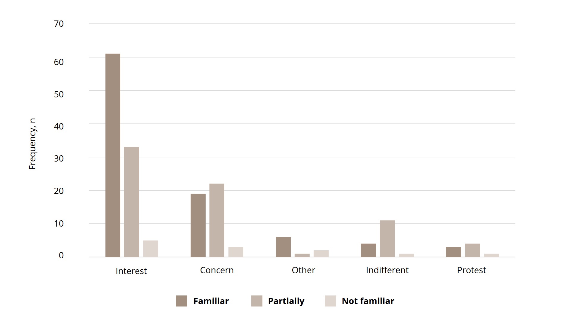 On the question about attitude toward ICD-11 innovations among participants who were fully familiar with the ICD-11 draft, the following responses were obtained: “interest”, 61 (74.4%); “concern”, 19 (23.2%); “protest”, 3 (3.7%); “indifference”, 4 (4.9%); and others, 6 (7.3%). Among those who were at least partially familiar with ICD-11 (n = 137), the distribution of answers was as follows: 94 (68.6%), 41 (29.9%), 15 (10.9%), 7 (5.1%), and 7 (5.1%), respectively (Figure 5). Among 11 psychiatrists who were not familiar with ICD-11 draft, the following answers were observed: “interest”, 5 (45.5%); “concern”, 3 (27.3%); “protest” and “indifference”, 1 (9.1%); and other attitudes, 2 (18.2%).