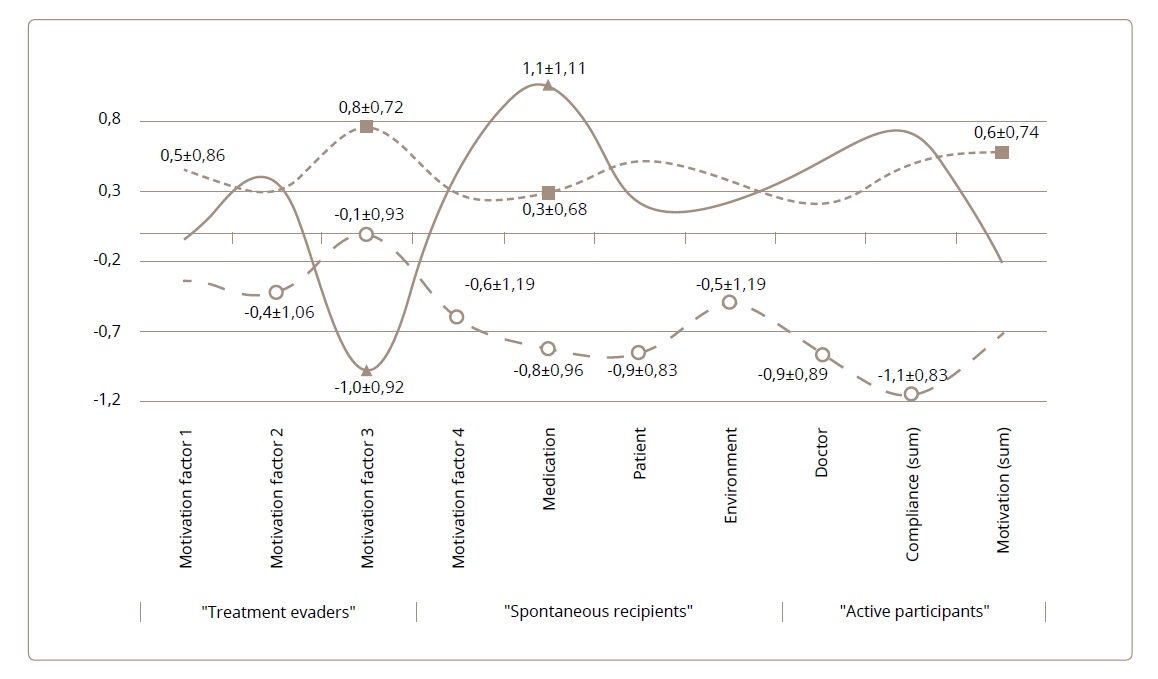 Figure 1. Typology of patients depending on the prevailing structure of treatment motivation and the corresponding profile of medication compliance (means and standard deviations of questionnaires standardized indices).
