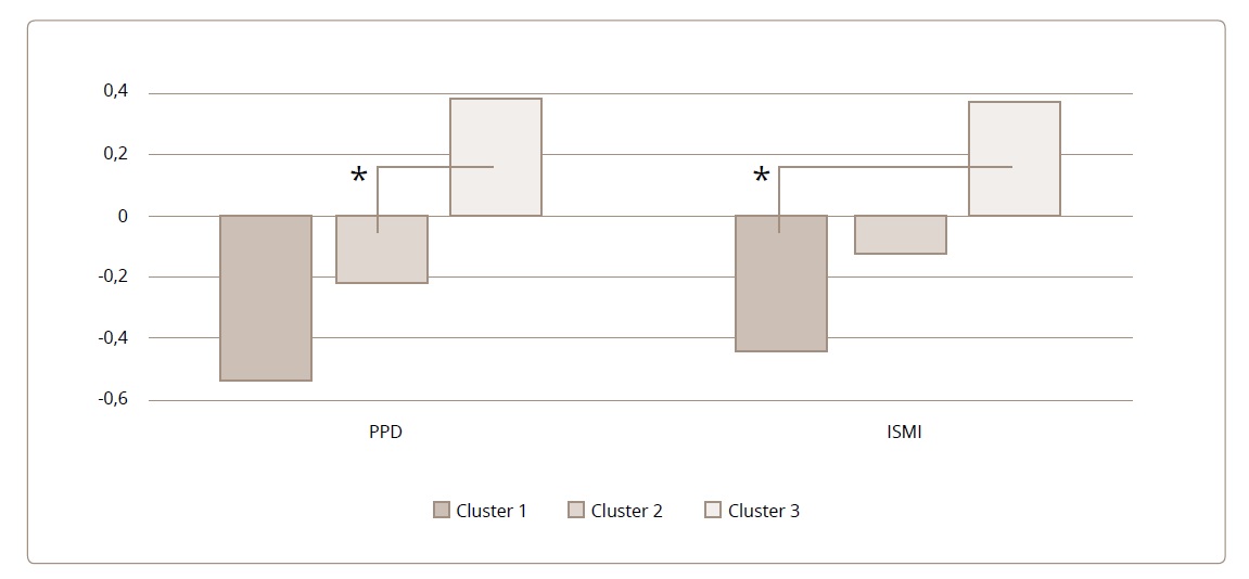Footnote. PDD — Perceived Discrimination and Devaluation Scale (low scores reflect higher external stigmatization); ISMI — discrimination resistance subscale of Internalized Stigma of Mental Illness; Cluster 1 — patients «avoiding treatment»; Cluster 2 — «passive recipients» of treatment; Cluster 3 «active treatment participants». *p<0,05