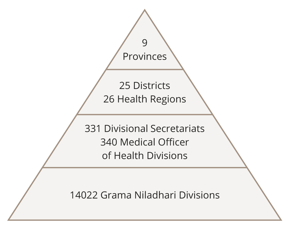 The provincial directors of health head up the administrative structure with the district directors of health for each district under them. Each district is then served by a defined number of medical officers of health (MOHs), who are responsible for a defined geographical area with a defined population. In each MOH area, services are provided by medical officers and several categories of field personnel, including public health nursing sisters, public health inspectors and public health midwives, who mainly focus on preventive aspects of healthcare delivery.10