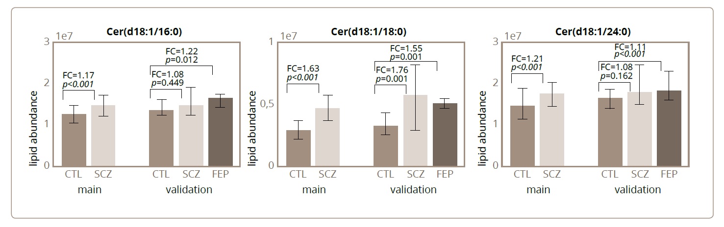 METHODS: We measured the abundances of Cer(d18:1/16:0), Cer(d18:1/18:0), and Cer(d18:1/24:1) in a cohort of 82 patients with schizophrenia and 138 controls without a psychiatric diagnosis and validated the results using an independent cohort of 26 patients with schizophrenia, 55 control individuals, and 19 patients experiencing a first psychotic episode.