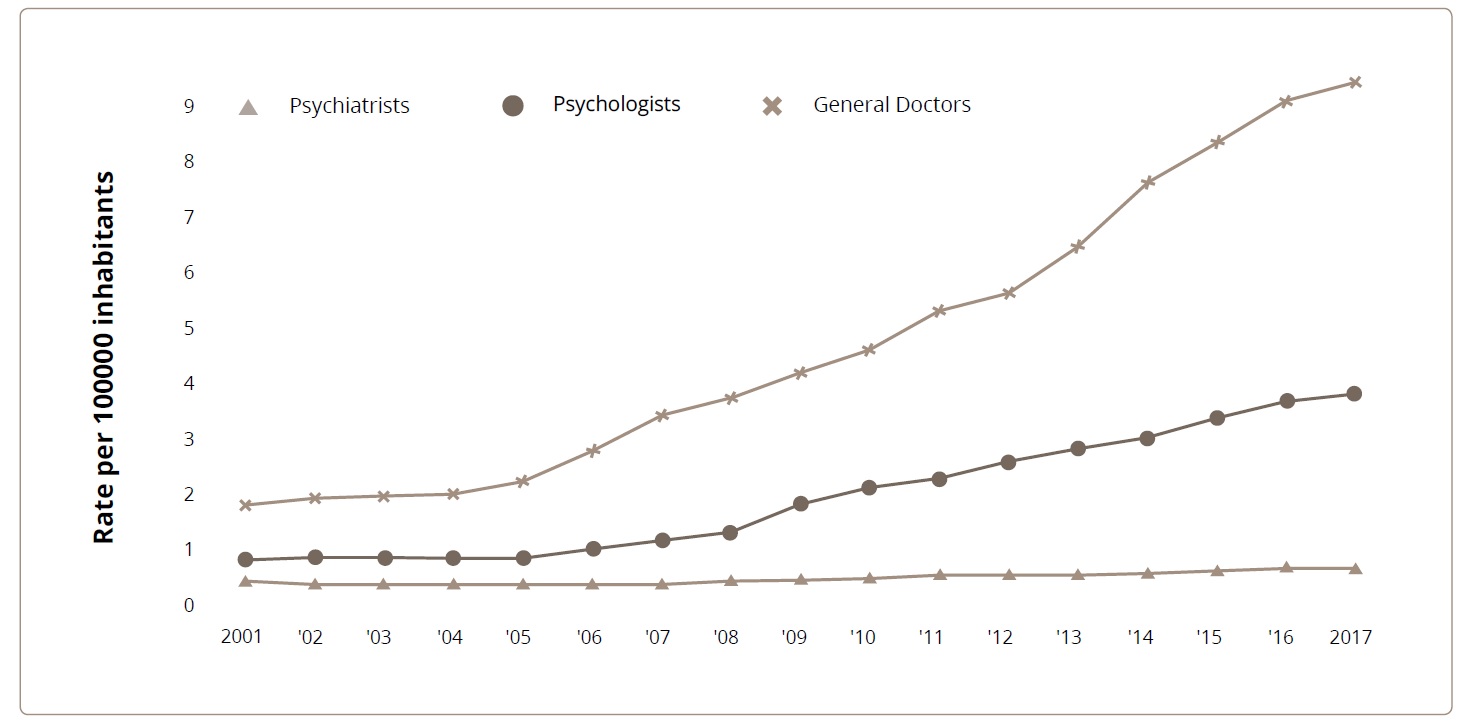 Coinciding with this trend in services, human resources have also increased. From 2001 to 2017, within the services coordinated by the Ministry of Health, the number of psychiatrists rose from 0.5 to 0.7 psychiatrists per 100,000 inhabitants; GPs working in mental health services increased fivefold (from 1.9 to 9.5), while the number of psychologists increased fourfold from 0.9 to 3.9 psychologists per 100,000 inhabitants (Figure 3).