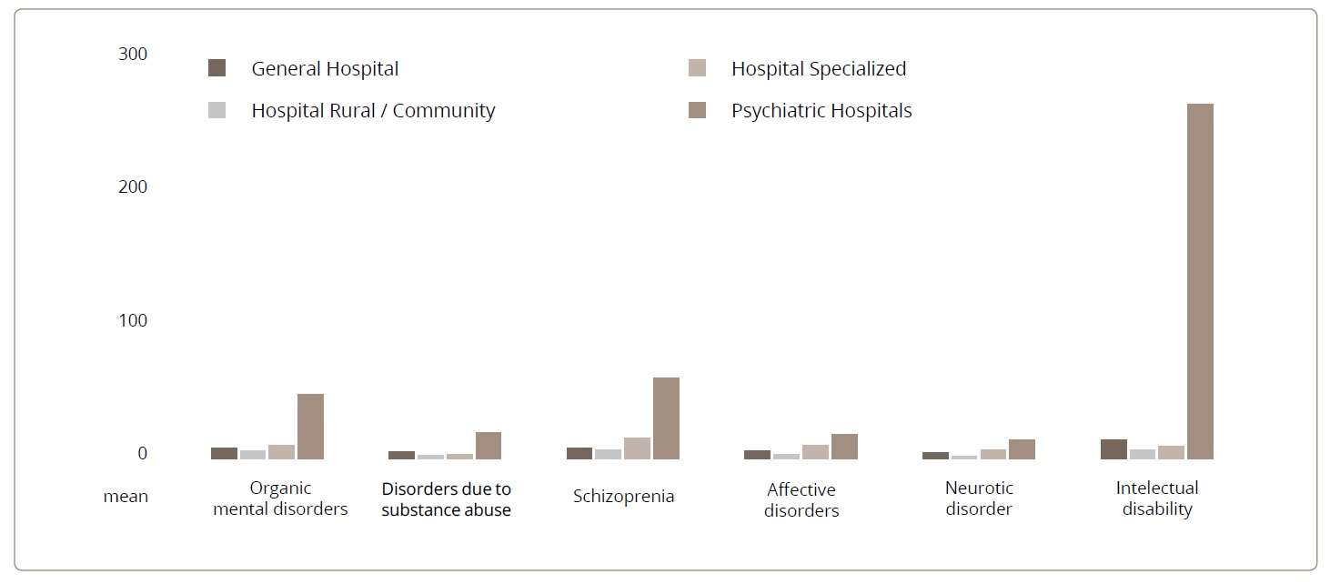 Inpatient care days varied according to the type of disorder and the characteristics of the care services. Psychiatric hospitals had the longest stays of all services for all disorders, except for personality disorders, the duration of which was the same in psychiatric hospitals and specialized hospitals. Intellectual disability involved the lengthiest stays (from 263 days in psychiatric hospitals to 6.6 days in hospitals located in rural communities) (Figure 4).