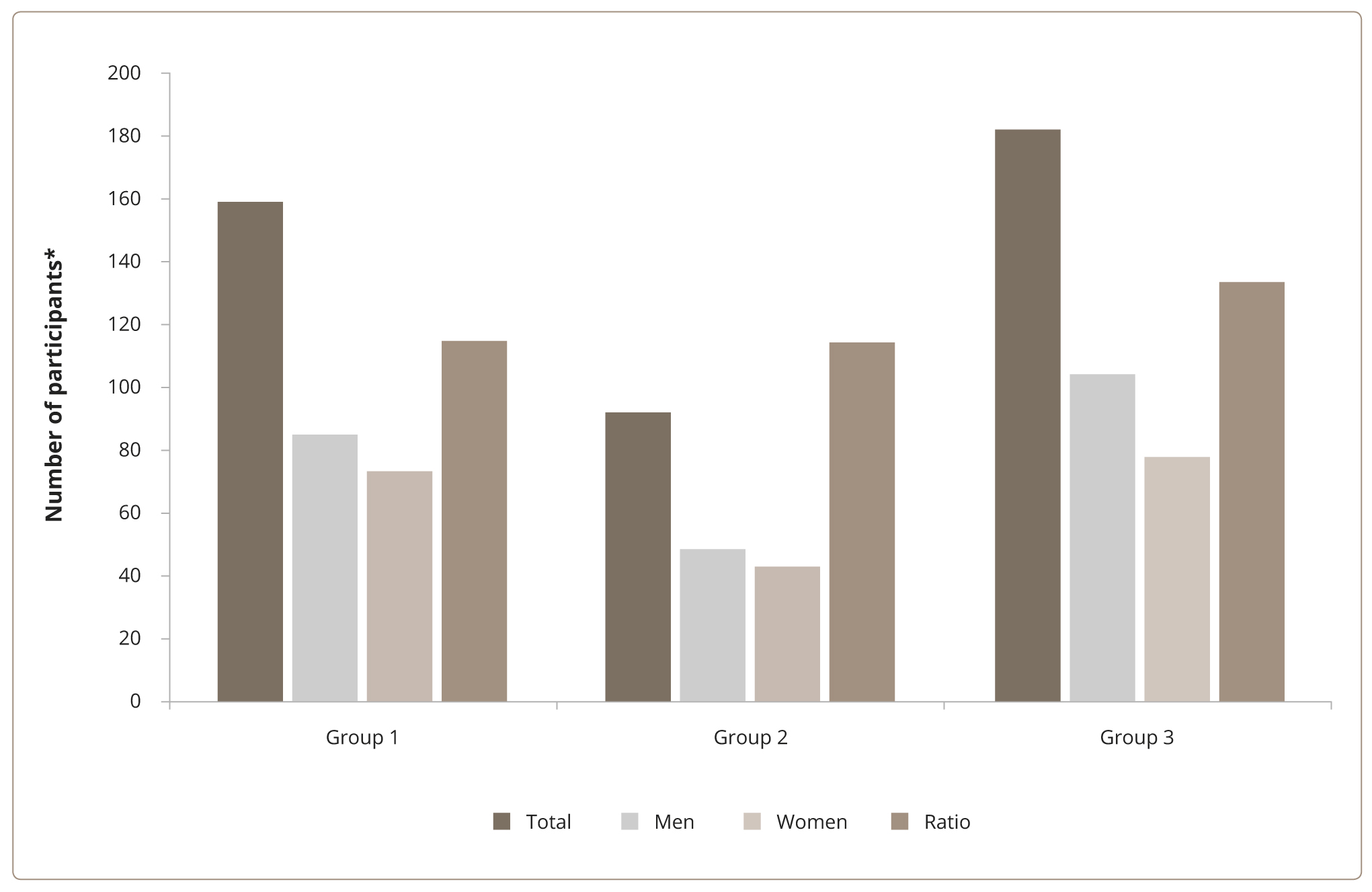Figure 1. Studied groups — gender distribution. Note: * M : F ratio is multiplied by 100 to adjust scaling.