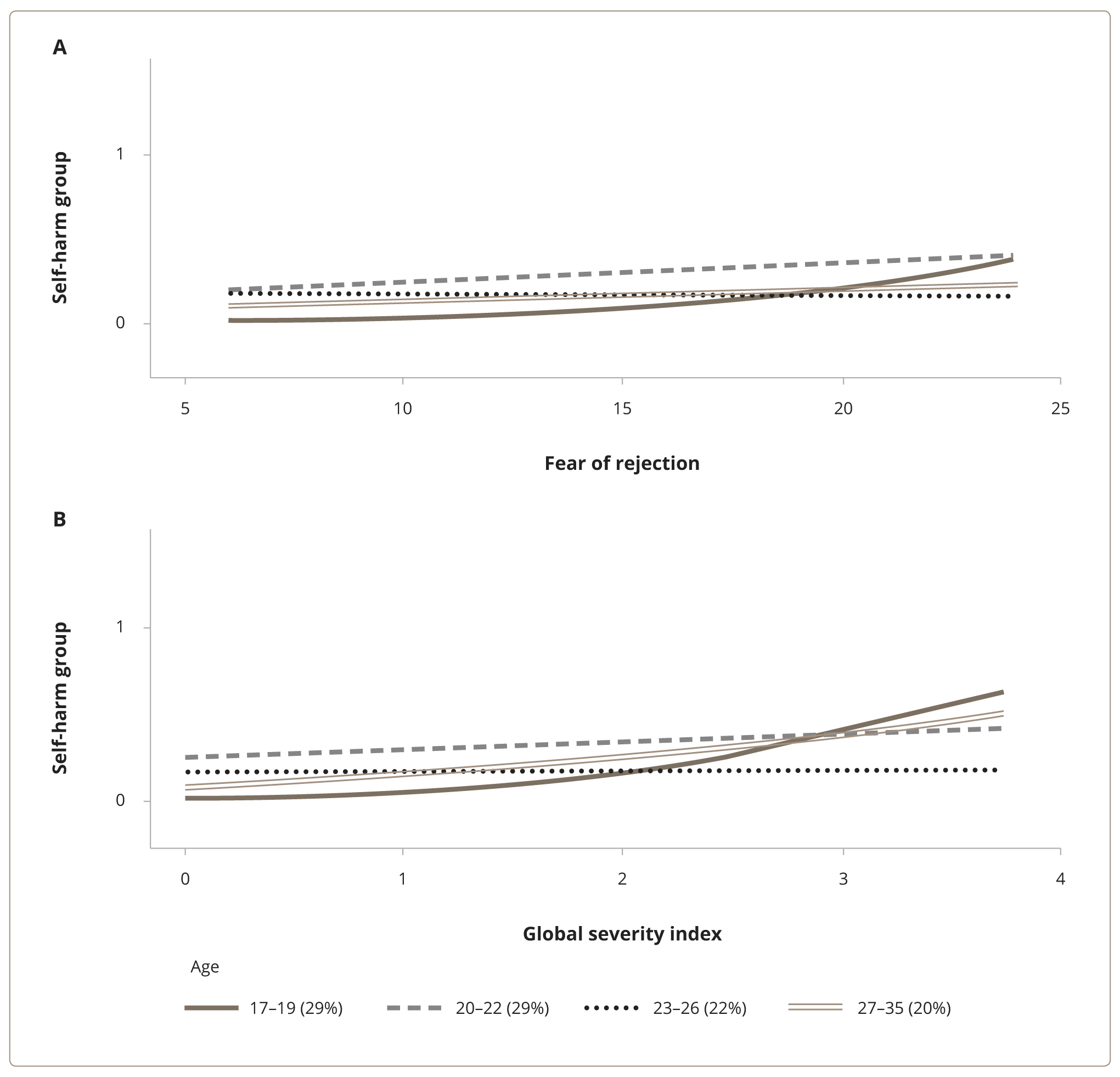 Curiously, age didn’t have an impact on self-harm severity when it was introduced into the models as a continuous variable. Based on the discovered interactions between age groups, fear of rejection, and global severity index and their impact on self-harm, we can assume that the relationship between age and self-harm is not linear. Younger people (17- to 19-year-olds) tended to stick to more superficial self-injuries, whereas 20- to 26-year-olds reported more severe self-destructive behaviors. This could indicate a potential trajectory for self-harm that starts from relatively superficial behavior in adolescence (mean age of self-injurious behavior incidence is 15, according to [34]) but gets more severe and incorporates risky behavior, disordered eating behavior, and substance abuse in young adults. The rise in self-harm severity in cases where it was kept secret and left untreated in adolescence was shown in previous studies [35].