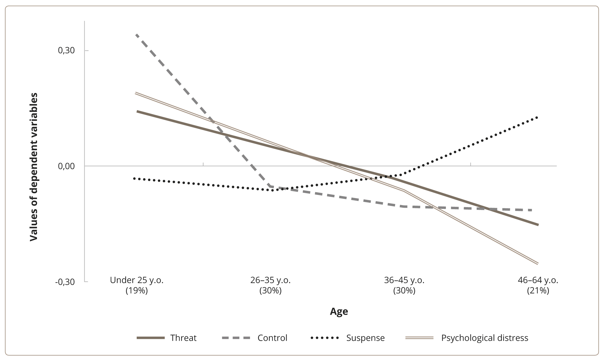 To determine how age affects psychological distress and perceptions of the pandemic, respondents were divided into four age groups. Figure 2 shows the number of each group and representations of the values on the scales under analysis in each group. Since the survey was conducted online, the vast majority of our respondents (over 99%) are people of active age, that is, under 64. Therefore, the age periodization in our survey is limited by this age. The results show that Psychological Distress (F=8.647; p <0.0001) and Threat representations (F=3.782; p <0.010), as well as the perceptions of Control (F=11.984; p <0.0001), are mostly characteristic of younger respondents. It is worth noting that despite lower levels of Psychological Distress and Threat assessment in the older age group, the Suspense is higher in this group, though not to a significant degree.