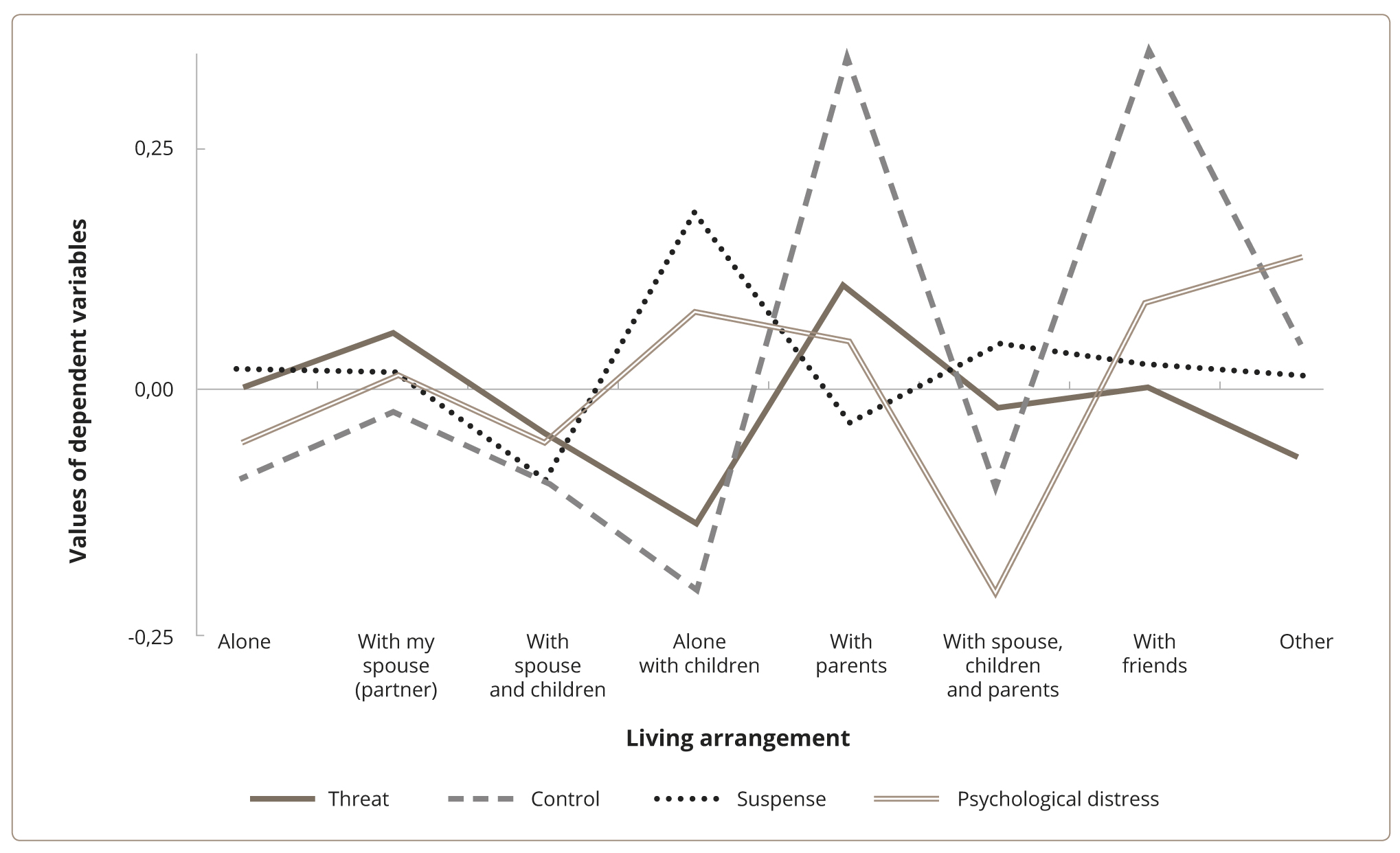 With regard to living arrangements, the results revealed a significant difference in Control scale (F=4.598, p <0.0001). It was shown increasing in Control scale in the group of respondents “living with parents” and “living with friends” compared with groups of respondents living alone (p <0.002), with a spouse (p <0.013), with a spouse and children (p <0.0001), and alone with children (p <0.001) (Figure 3). The high indicators on the “Control” scale in these groups of respondents can be explained by the fact that this type of respondents are mostly from the group of young people (see the previous paragraph).