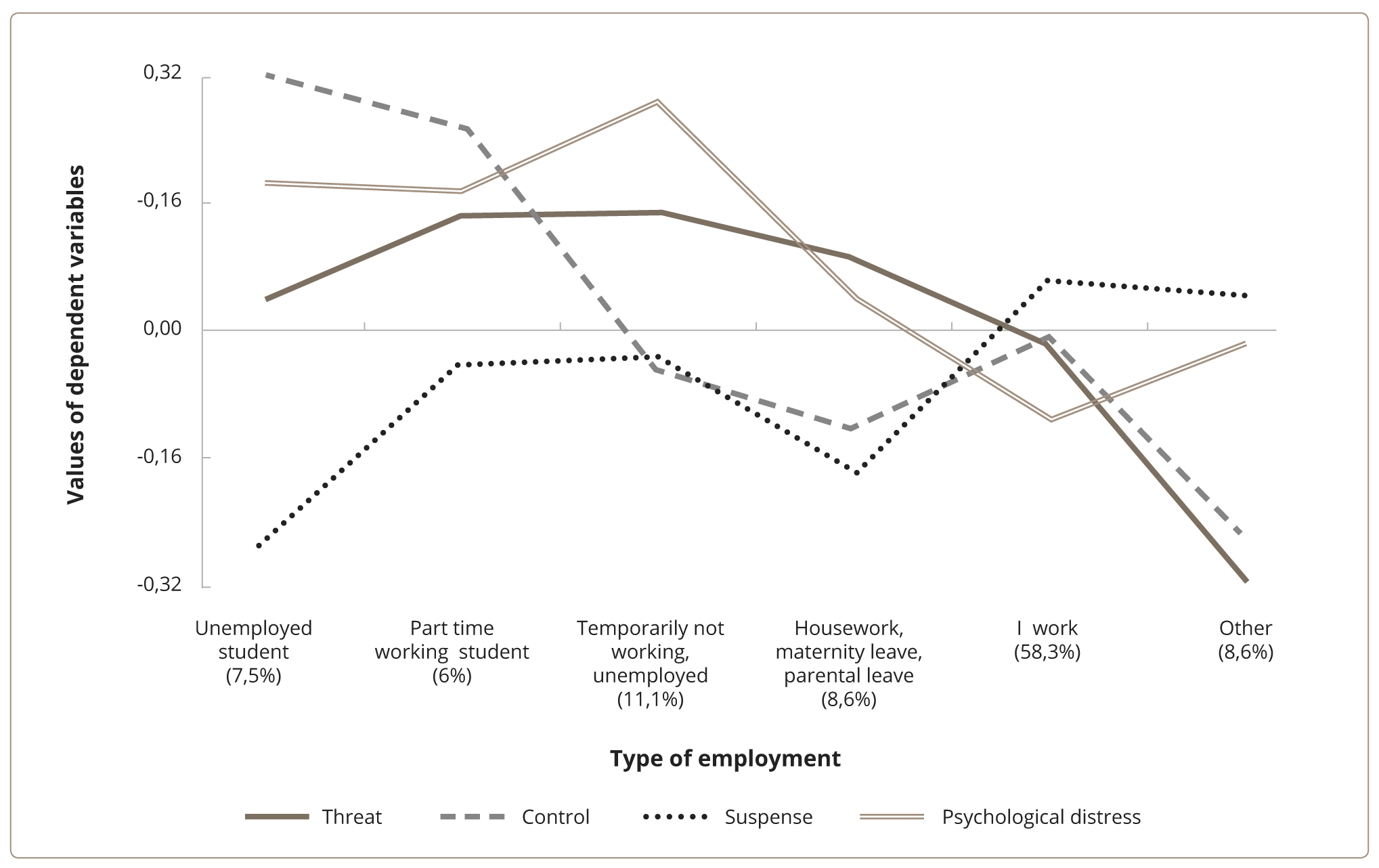 Significant differences across the scales were found depending on the type of employment at the time of the pandemic. For example, such variables as Threat (F=3.102, p=0.009), Control (F=4.598, p <0.0001) and Psychological Distress (F=4.896, p <0.0001) were less pronounced, whereas Suspense (F=2.540, p <0.027) was greater in the groups of respondents who “take care of the household/stay on maternity leave” (p <0.034) and “working” (p <0.05) compared to “non-working students” (Figure 6).