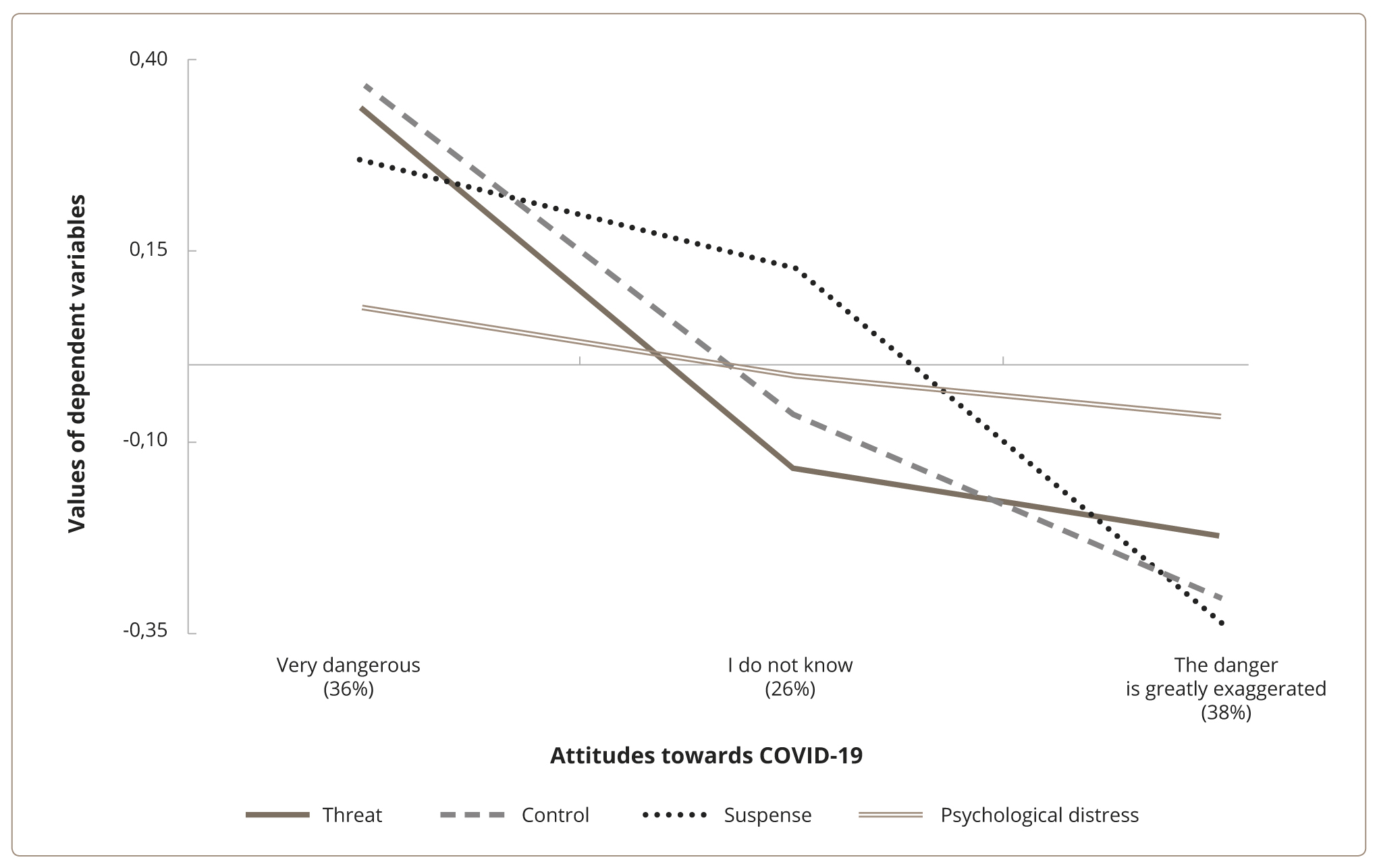 The perceptions of COVID-19 as an excessively exaggerated danger are associated with a lower intensity of psychological distress, a sense of understanding of the disease, and less control. This belief may have psychological benefits for reducing anxiety and stress but may result in fewer safety precautions being adopted and thus a greater risk of infection. At the same time, the exposure to real-life experiences in loved ones dramatically increases the suspense.