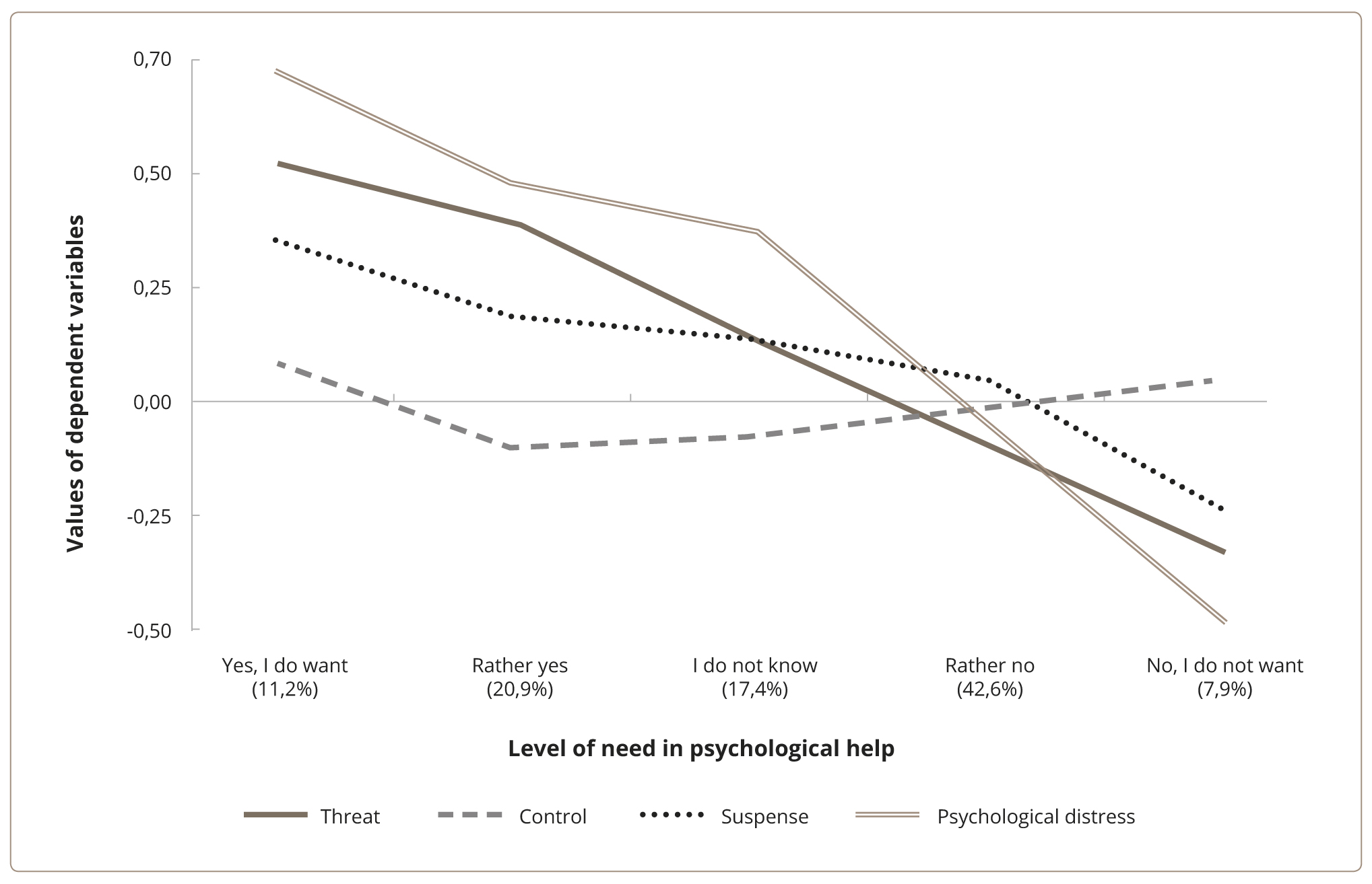 The factor structure of the modified version of the Perceived Stress Scale and State Anxiety Scale was explored in our previous study [21, 31] and indicated that “Psychological Distress” as a factor explains 73% of the general dispersion. Therefore, four factors, including Psychological Distress, Threat, Control, and Suspense were used as variables for further analysis. These factors represent centrally distributed normal values with a mean sample value of 0 and a standard deviation of 1 (Z-scores).