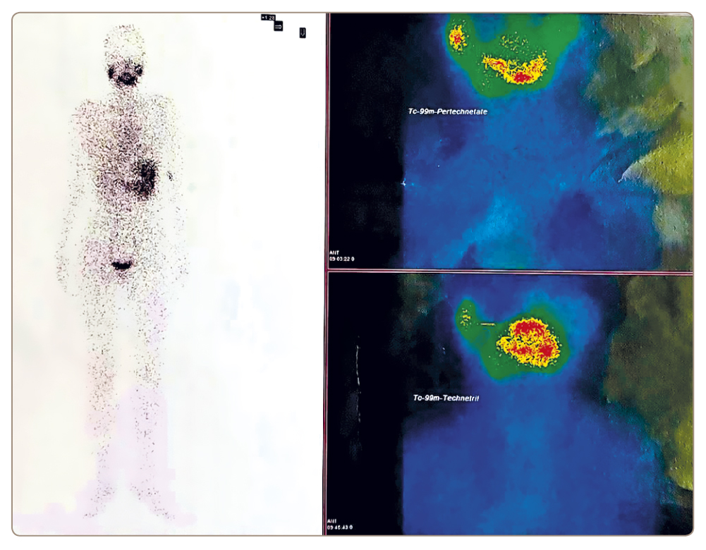 Based on the results of thyroid and whole-body scintigraphy with pertechnetate and Technetril, the following conclusion was made: “The thyroid gland is not visualized and whole-body scintigraphy showed no signs of ectopic functioning thyroid tissue” (Figure 2). The absence of Tc-99m-Technetrile in the thyroid gland may indicate a pronounced disorder of the functional state of thyrocytes (destruction?), while the absence of thyroid gland visualization during the study with Tc-99m-Pertechnetate may indicate a blocked thyroid gland.