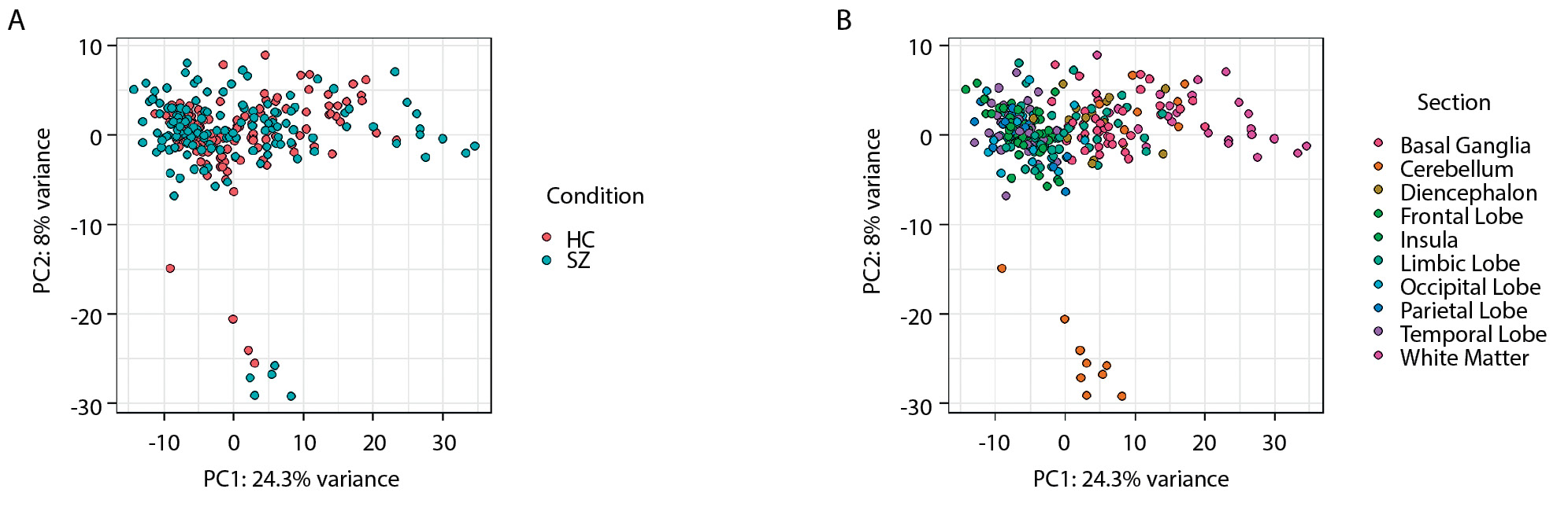 Previously, we published transcriptome data covering 33 regions of a healthy human brain [28]. Here, we analyzed gene expression in the same 33 regions in four individuals diagnosed with SZ, and two additional brain regions, temporopolar cortex (BA38) and secondary auditory anterior cortex (BA21a), in the diagnosed and control groups (Figure 1, Table S1 in the Supplementary). Based on these data, we detected the expression of 861 annotated human lincRNAs that passed the intensity threshold. Visualization of expression variation using the principal component analysis (PCA) showed substantial overlap of HC and SZ samples (Figure 2A), while the segregation of the samples with regard to anatomical regions was more evident (Figure 2B).