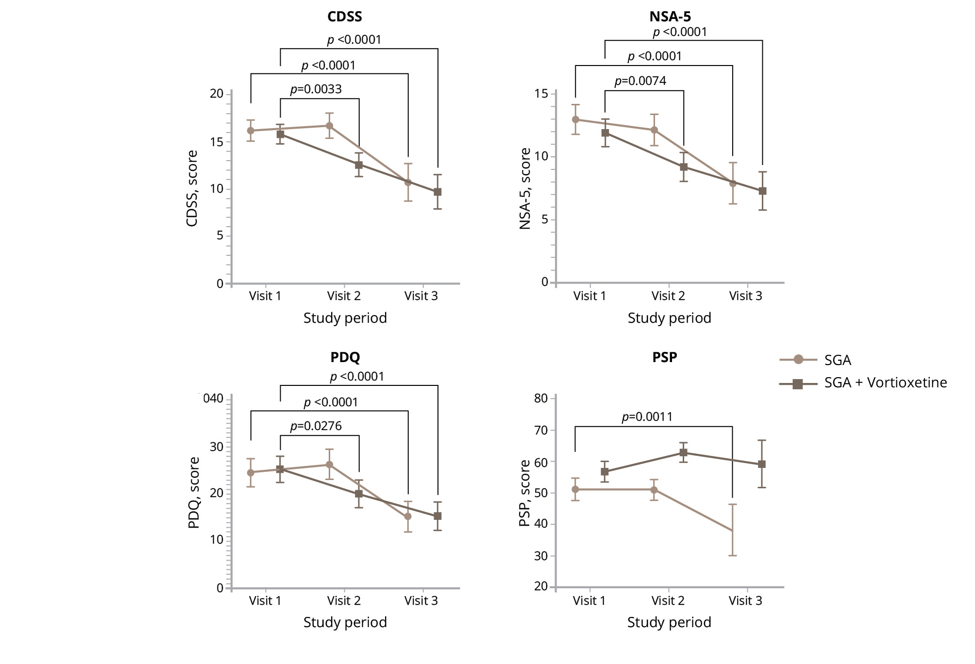 METHODS: We performed a comparative analysis of the changes in depression symptoms and negative symptoms, cognitive impairment, as well as function of 78 patients with severe manifestations of depression at the stage of exacerbation reduction and subsequent remission of paranoid schizophrenia. Combination treatment with SGA and vortioxetine was used in 39 patients, and 39 patients who had similar clinical manifestations received just SGA. During the observation period, the mental disorder severity and depression symptom severity were assessed 3 times (before the start of treatment, after three months, and after six months) using the Clinical Global Impression (CGI) scale and Calgary Depression Scale for Schizophrenia (CDSS), respectively; patients were also assessed using the Negative Symptoms Assessment-5 (NSA-5) scale, Perceived Deficits Questionnaire-20 items (PDQ-20) scale, and Personal and Social Performance (PSP) scale.