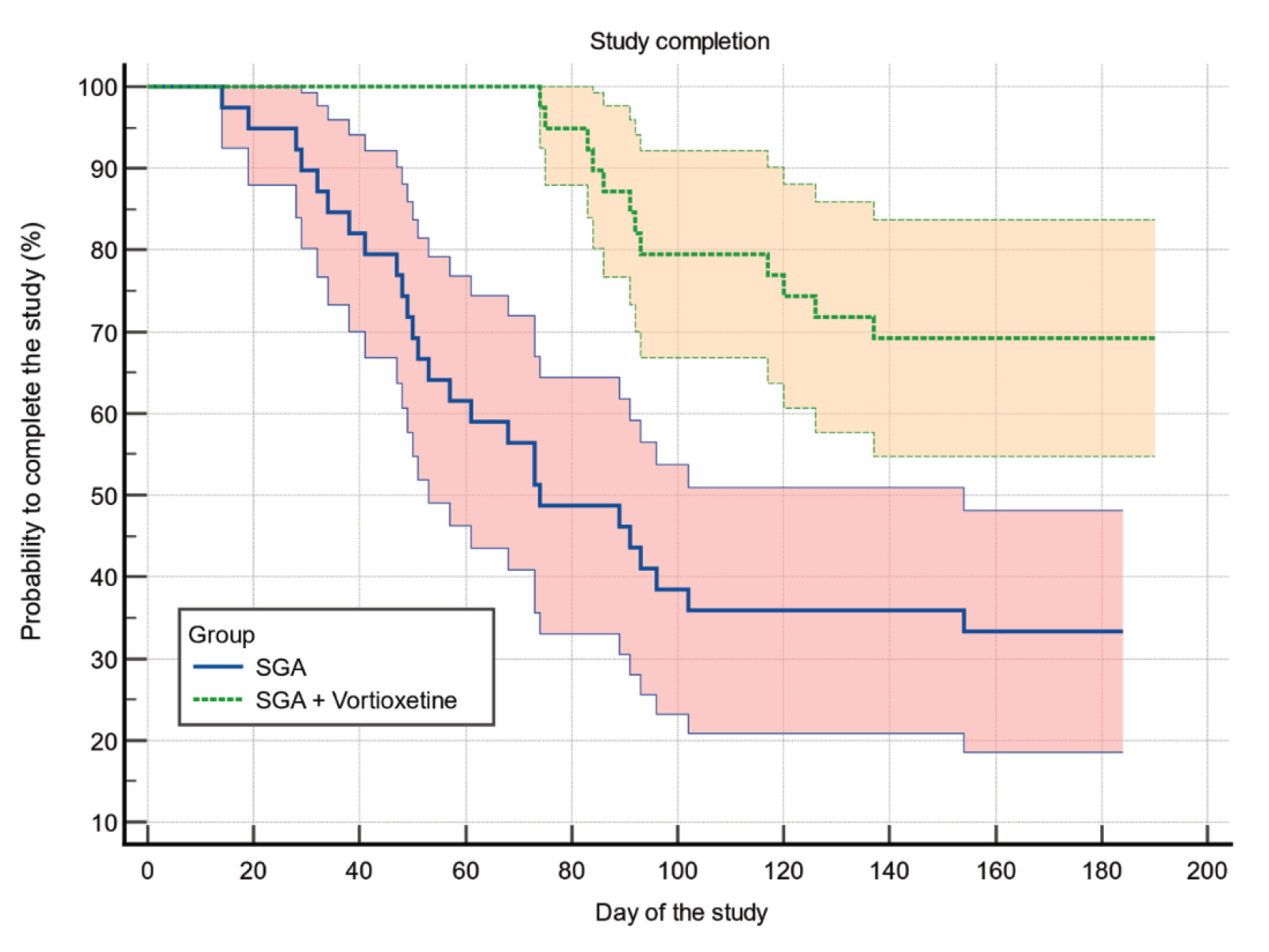 RESULTS: According to the ANOVA results, by the end of the observation period, patients, regardless of their therapeutic group, showed a statistically significant decrease in the level of depression on the CDSS scale, the severity of negative symptoms on the NSA-5 scale, cognitive symptoms on the PDQ-20 scale, as well as an improvement in personality and society, judging by the increase in the total PSP scores. There were also significant differences between the compared main (SGA + vortioxetine) and control (SGA) groups in terms of the changes in the total score on the CDSS and PSP scales. An interesting aspect of the changes in the clinical scores was a noticeable improvement in the SGA + vortioxetine group after 3 months of treatment, in the absence of a similar improvement in the control group, and the achievement of approximately the same scores in both groups after 6 months. In particular, there were significant differences between the SGA + vortioxetine and SGA groups in terms of the mean CDSS (p <0.001), NSA-5 (p=0.003), PDQ-20 (p <0.001), and PSP (p=0.004) scores after 3 months. Analysis of the time before early withdrawal from the study showed that significantly more patients in the SGA + vortioxetine group completed the study program (n=27, 69.23%) compared with the SGA group (n=13, 33.33%) (χ2 =14.618, df=1, p <0.001, log-rank test. The mean survival time in the SGA group was significantly (p <0.001) less and amounted to 101.436 days (95% CI: 81.518–121.354), and in the SGA + vortioxetine group it amounted to 161.744 days (147.981–175.506). The relative risk of full study completion in the vortioxetine + SGA group compared with that in SGA was 3.618 (1.871–6.994).