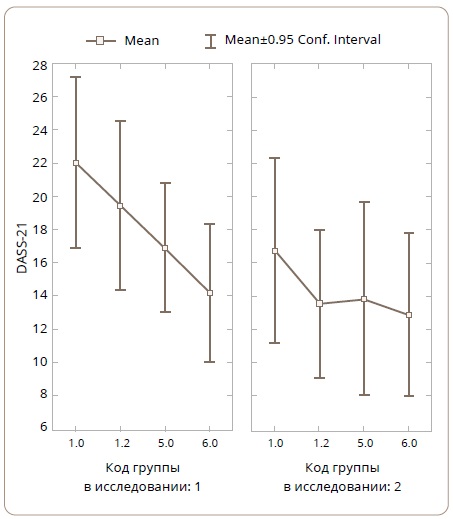 В контрольной группе пациенты не обнаружили значимой динамики по изученным показателям по сравнению с исходной оценкой, за исключением балла по шкале DASS-21 к пятому дню исследования. Таблица средних значений показателей шкал группы сравнения и значимость изменений на каждом визите приведена в табл. S1 Приложения.