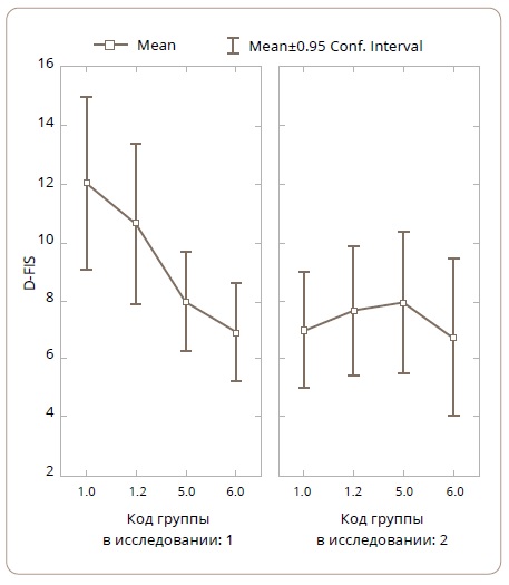 Рисунок 5. Динамика показателей шкалы D-FIS в экспериментальной и контрольной группах.