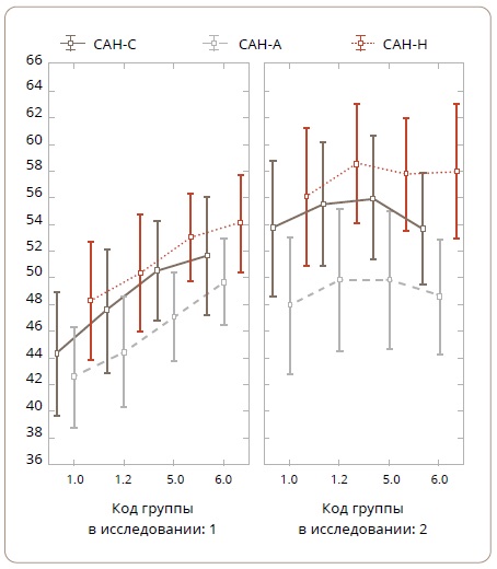 CAH-A ↑ | 42,50±11,89 | 44,41±12,87 | 0,89 | 47,05±10,1 | 0,03** | 49,67±9,12 | 0,0008** |
