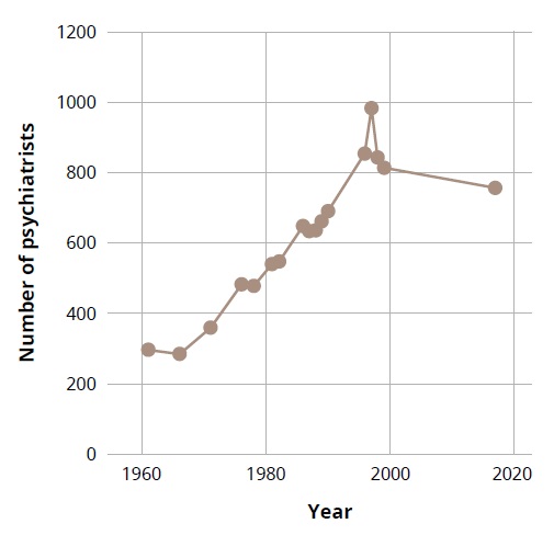 Согласно данным, опубликованным в медицинской справочной литературе (рис. 1) наблюдается отчетливое уменьшение количества психиатров с 987 в 1996 г. до 759 в 2016 г. К сожалению, за последние 7 лет эта тенденция усугубилась, и каждые 2 года наблюдается невосполнимое уменьшение количества врачей примерно на 100 человек. Возможным объяснением этого процесса могут быть плохие условия труда, включая организационный и психологический климат, которые часто приводят к эмоциональному выгоранию [11, 12].