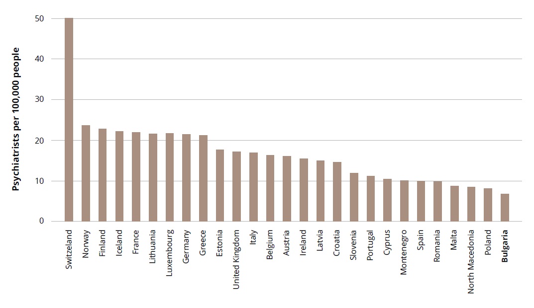 В Болгарии имеется нехватка медицинских специалистов во всех областях. Психиатрия относится к областям медицины с наибольшей нехваткой персонала. Также существует проблема с несколькими линиями финансирования различных структур психиатрической помощи, что приводит к неравномерному распределению врачей в них.