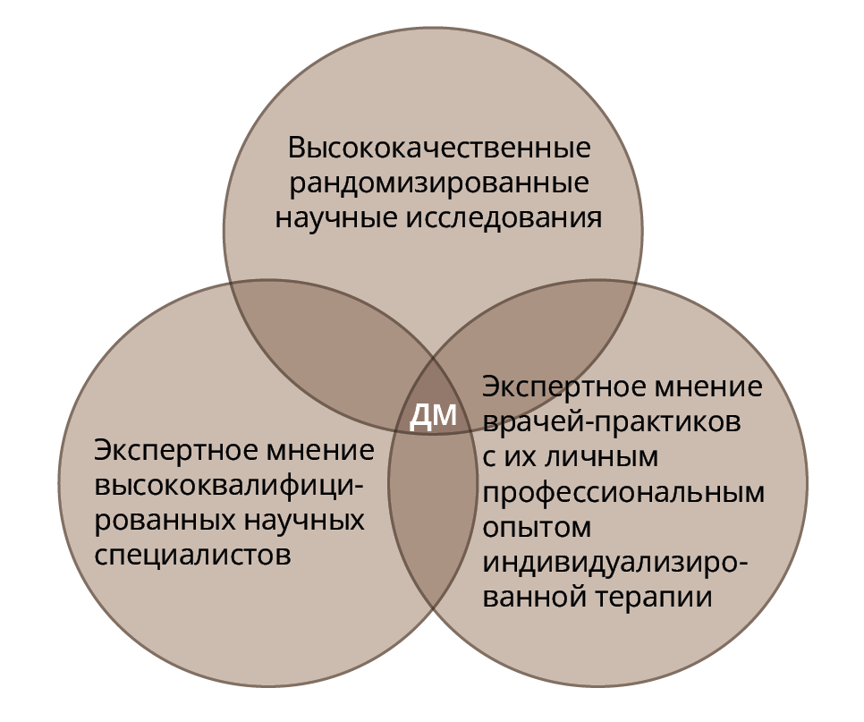 На этом фоне все более явственным становится представление о том, что доказательность в медицине, должна — чтобы приносить исключительно пользу — включать в себя три обязательные взаимопересекающиеся составляющие (рис. 1).