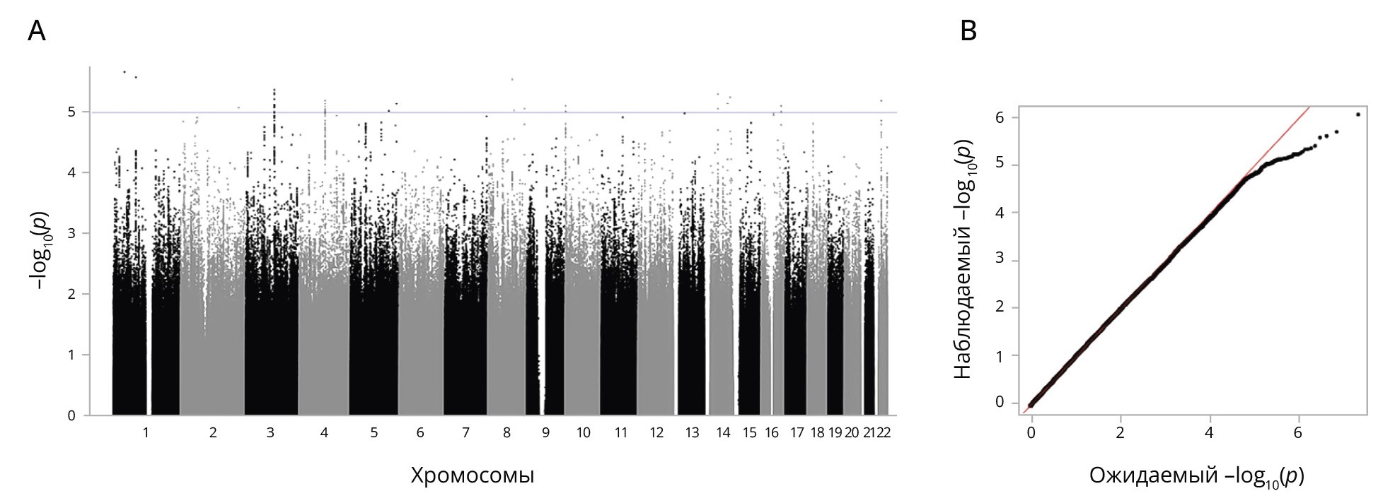 Рисунок 1. Результаты GWAS для фенотипа ангедонии в течение жизни. Примечание: (А) Манхэттенский график фенотипа ангедонии в течение жизни. Анализ ассоциаций значения p для каждого SNP нанесены на график (в виде –log10(p)) в зависимости от положения на хромосоме. Синяя линия указывает уровень значимости p <1x10–5. (B) График Q-Q для фенотипа ангедонии в течение жизни. График Q-Q демонстрирует наблюдаемое и ожидаемое значение p для каждого варианта.